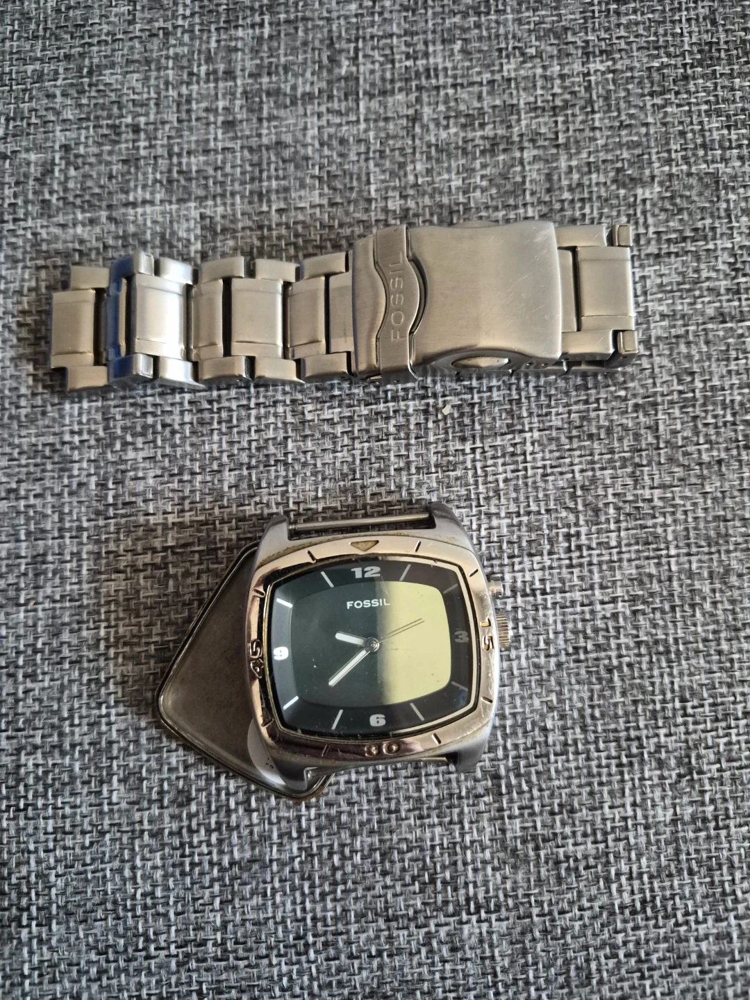 This is a Fossil stainless steel men's watch. It has a silver metal band with a deployment clasp and the Fossil logo. The watch is not working.