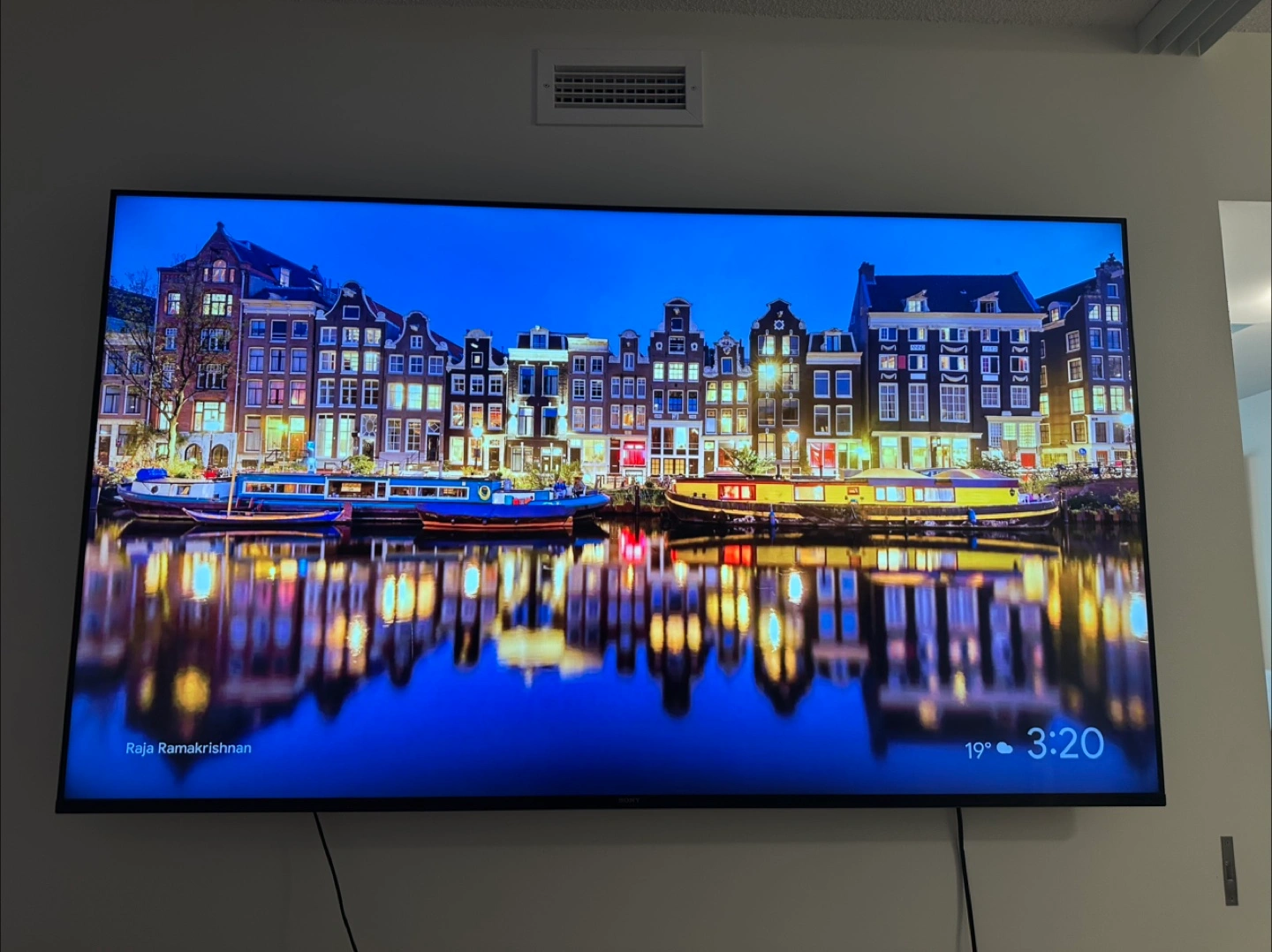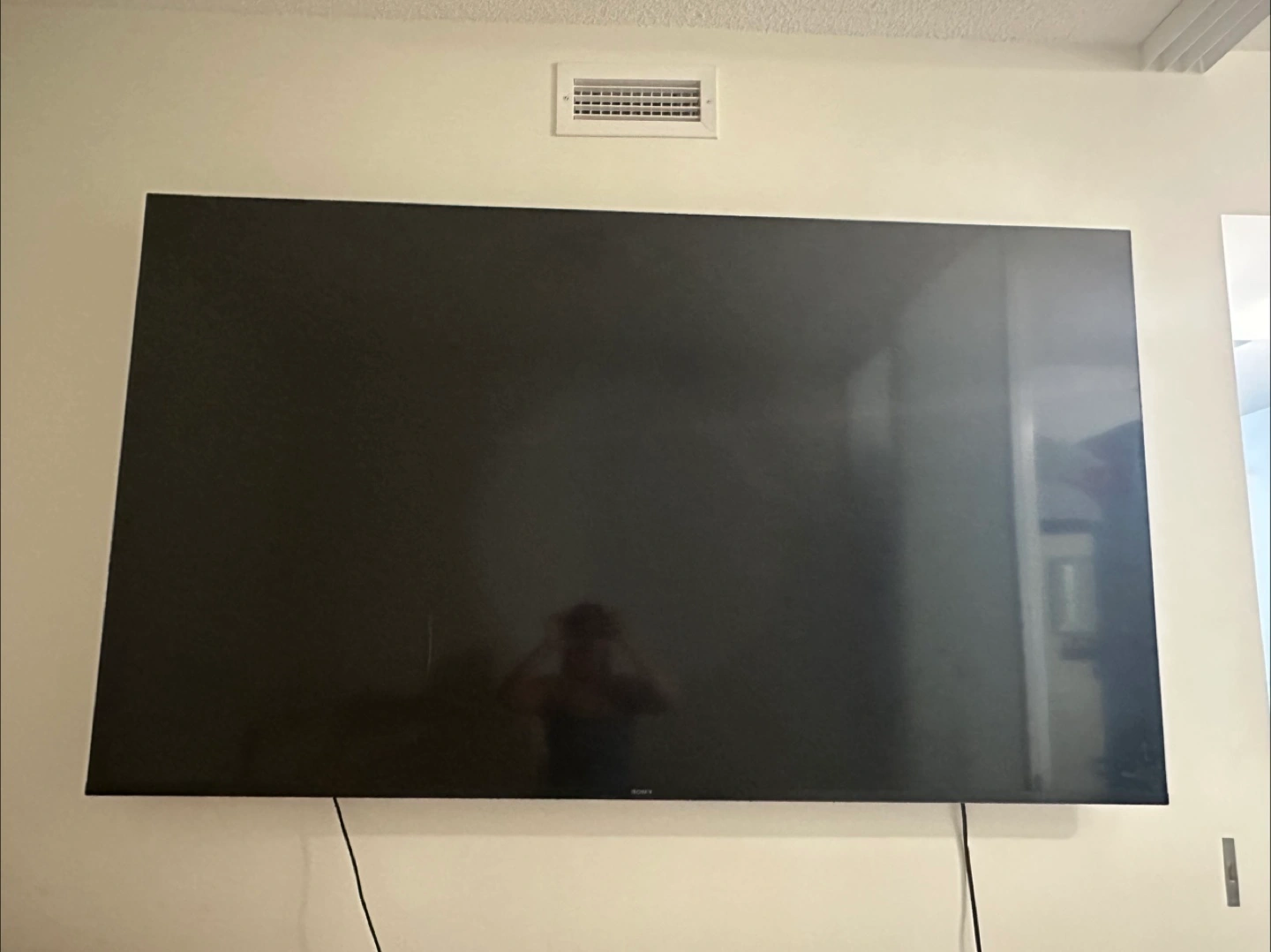 Large screen smart TV. Excellent picture quality. Wall mounted. Includes remote. Great for home theatre.