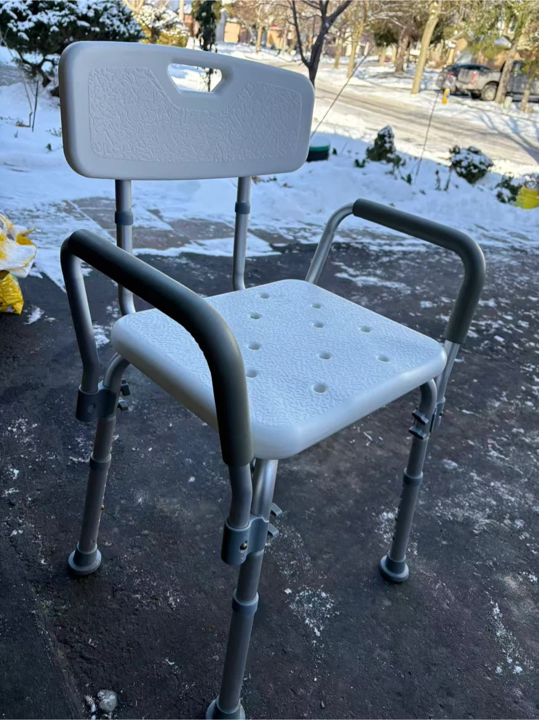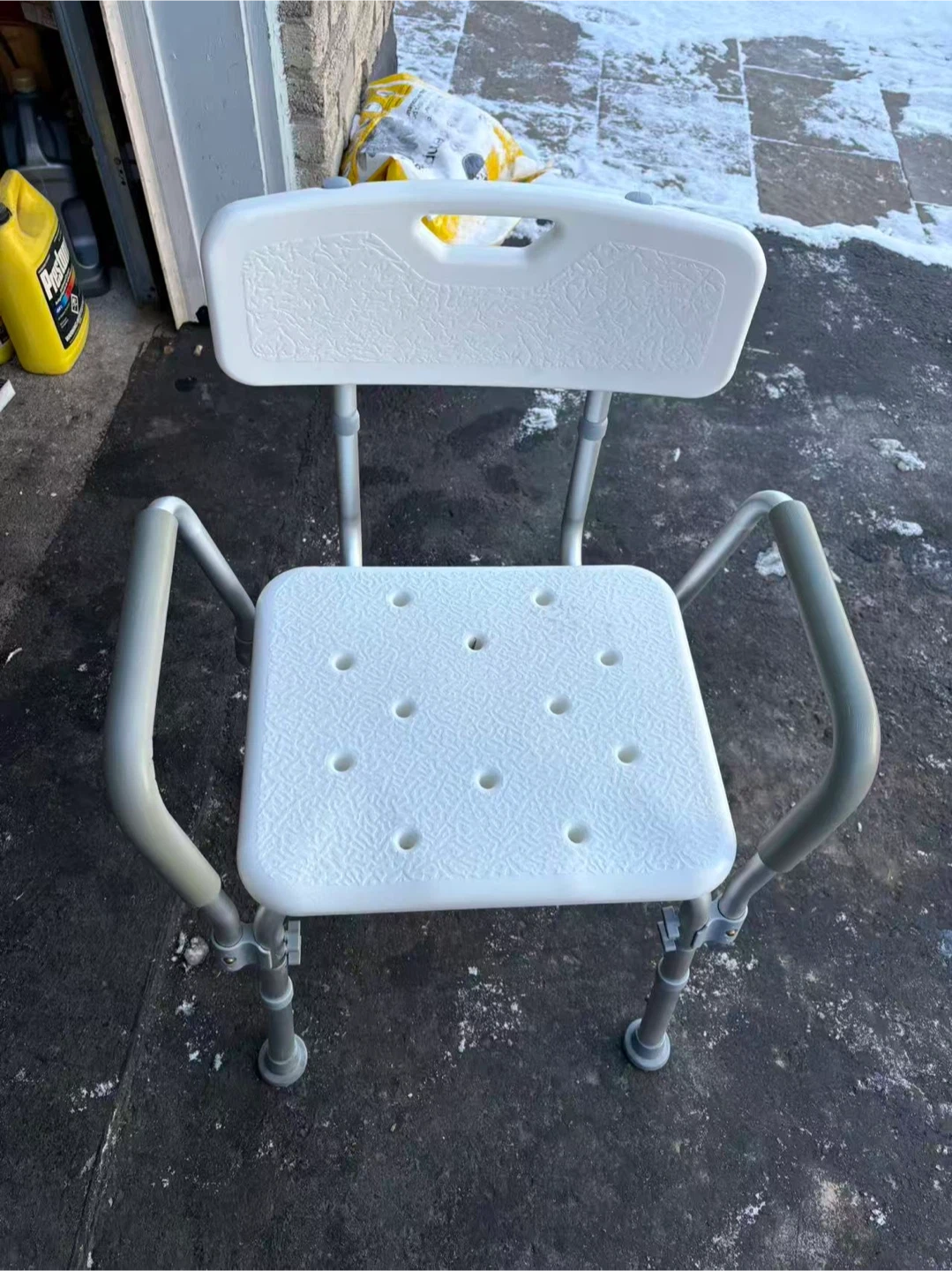 Adjustable bath and shower chair. It comes with a backrest and armrests for added comfort and support. The height is adjustable to suit your needs.