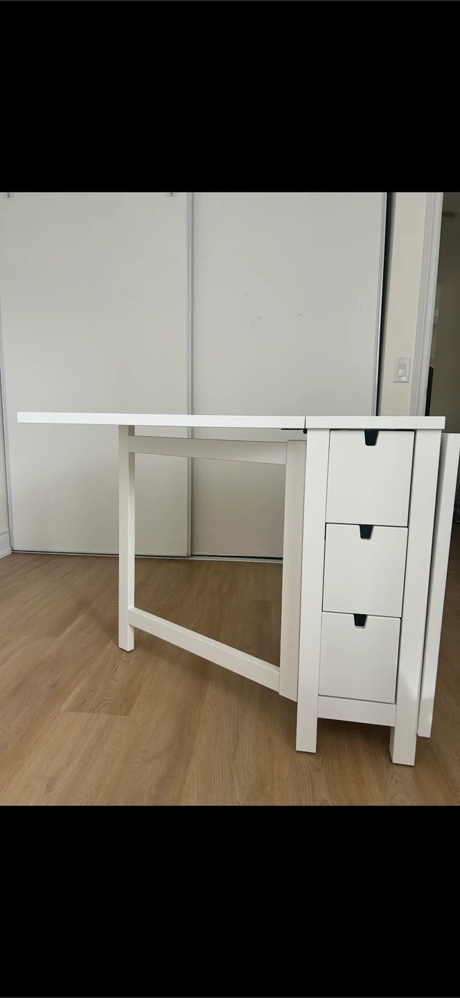 A versatile white folding desk featuring a convenient set of three drawers. It's perfect for small spaces or for adding extra workspace when needed. The design allows for easy folding and storage.