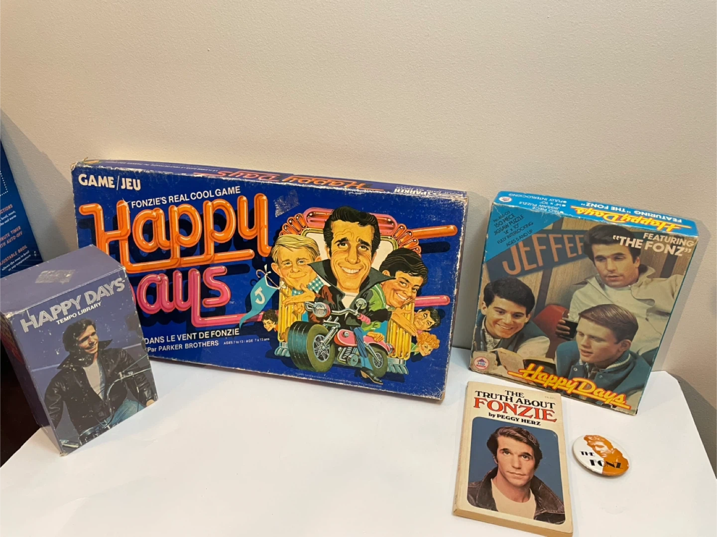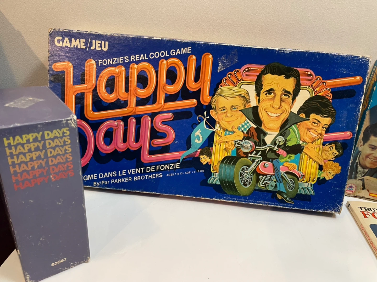 Vintage Happy Days board game by Parker Brothers, featuring Fonzies Real Cool Game. Includes the Tempo Library book set and 'The Truth About Fonzie' book. Great for fans of the classic show! Only 5$ each