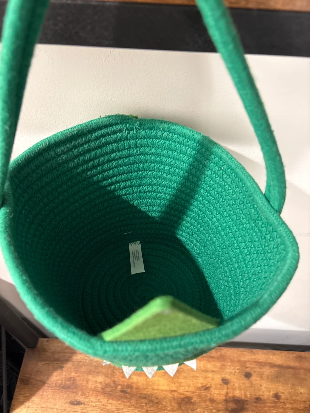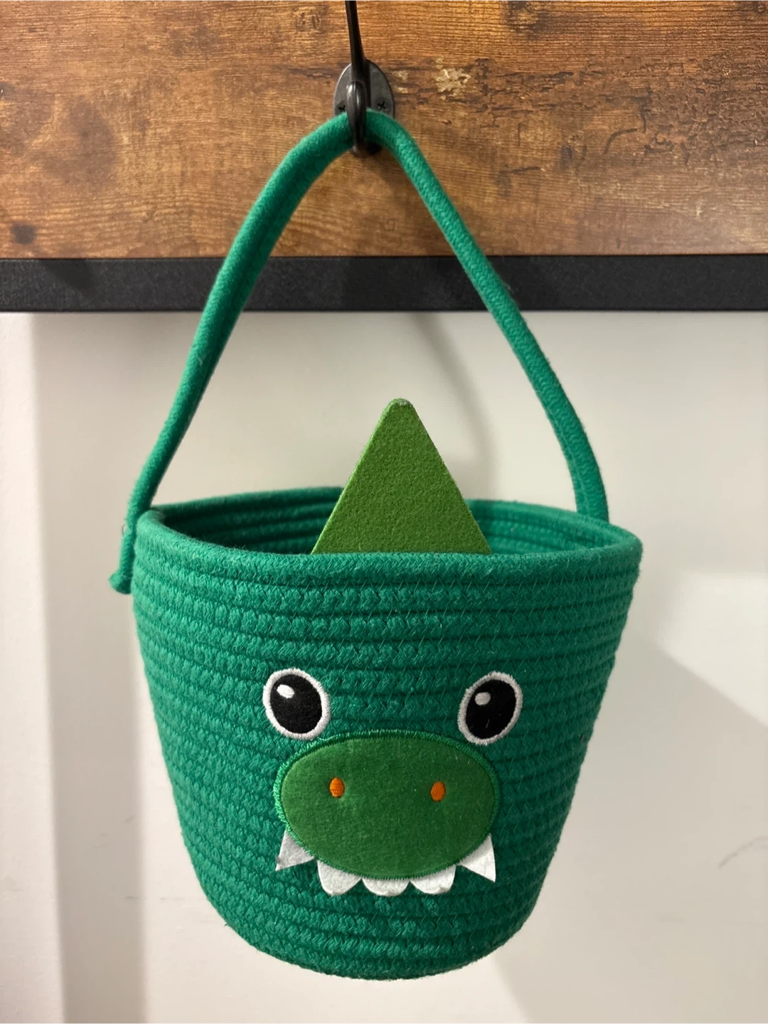 This cute green basket is shaped like a dinosaur with felt teeth and eyes. It's made of sturdy rope and has a handle for carrying. Perfect for storing small toys or Easter treats!