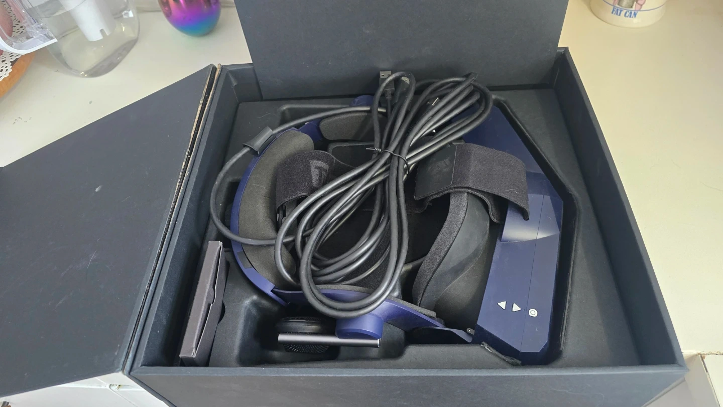 This is an Pimax Vision 8K X VR Headset. It comes with all original cables and packaging. The headset is blue and black. It's ready for your next virtual adventure!