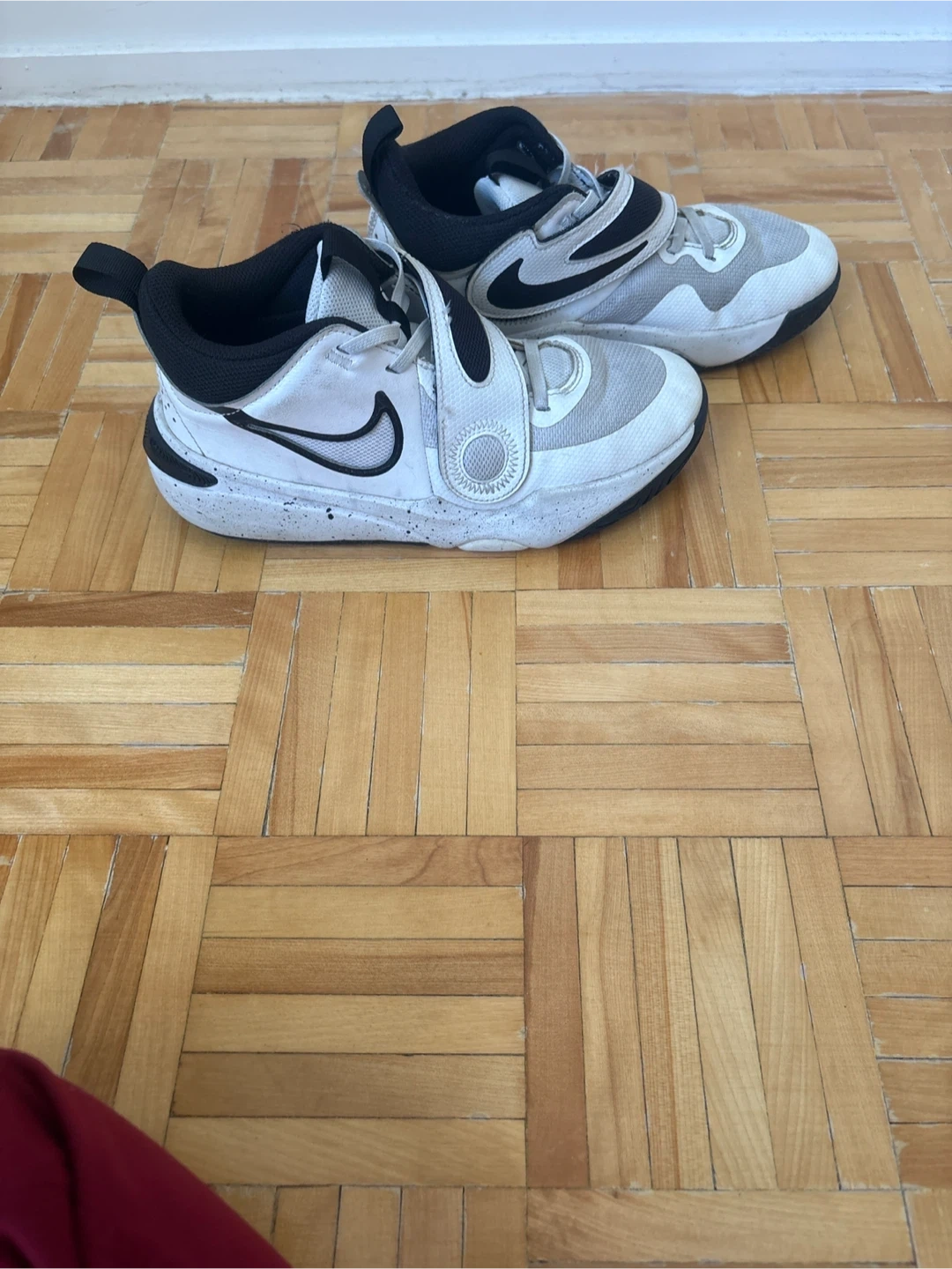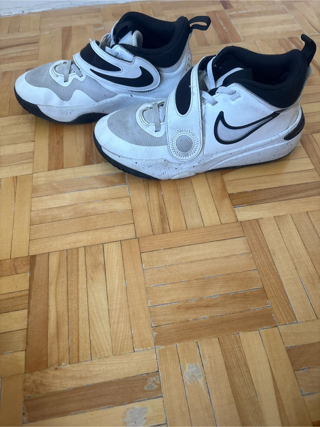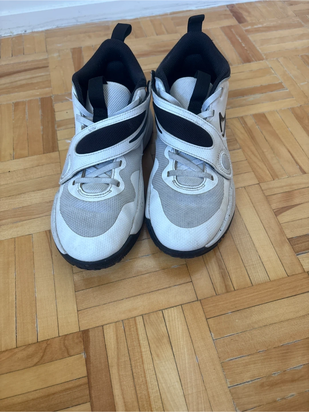 White and black Nike shoes for kids. They feature a hook-and-loop strap for easy adjustment. These are mid-top sneakers. The prime basketball shoes for starters.