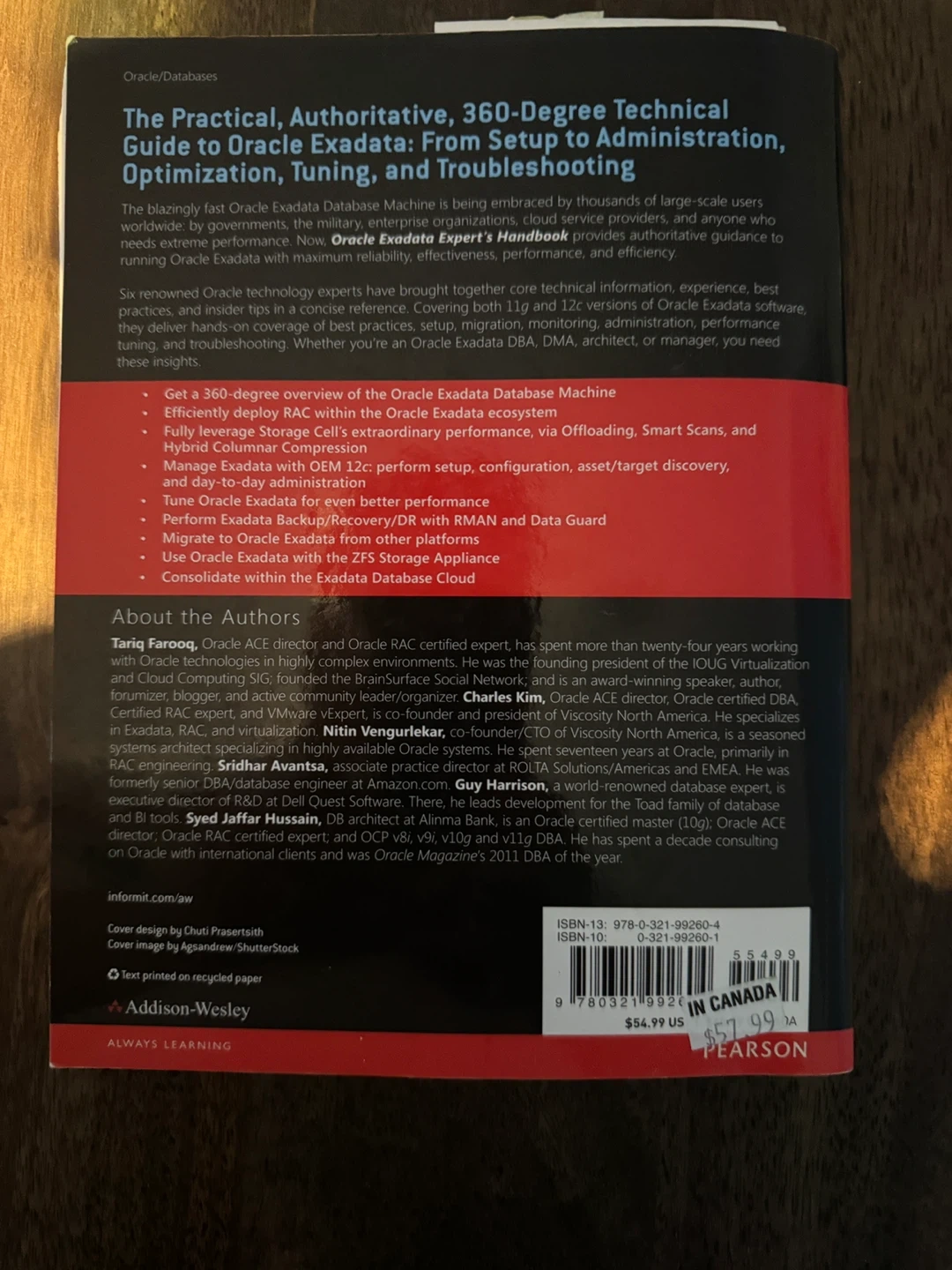 349Selling the Oracle Exadata Expert's Handbook. It covers versions 11g and 12c. The authors are Tariq Farooq, Charles Kim, Nitin Vengurlekar, Sridhar Avantsa, Guy Harrison, and Syed Jaffar Hussain. Originally bought for $57.99 in Canada