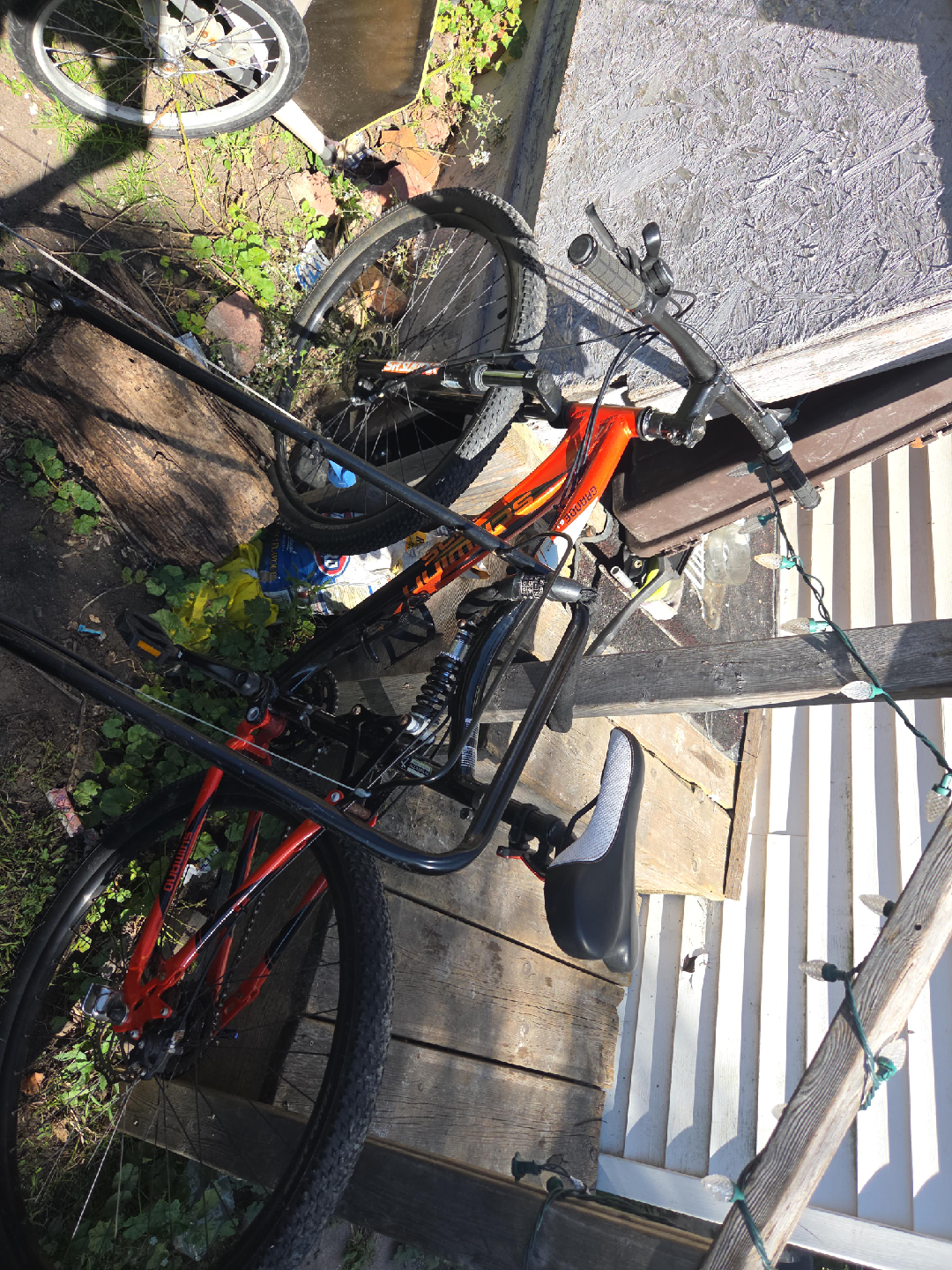 Selling a mountain bike with an orange and black frame. It looks like it's been used, but still has lots of life left in it! The tires are in good condition, and the seat is comfortable. Perfect for hitting the trails or just cruising around the neighbourhood
