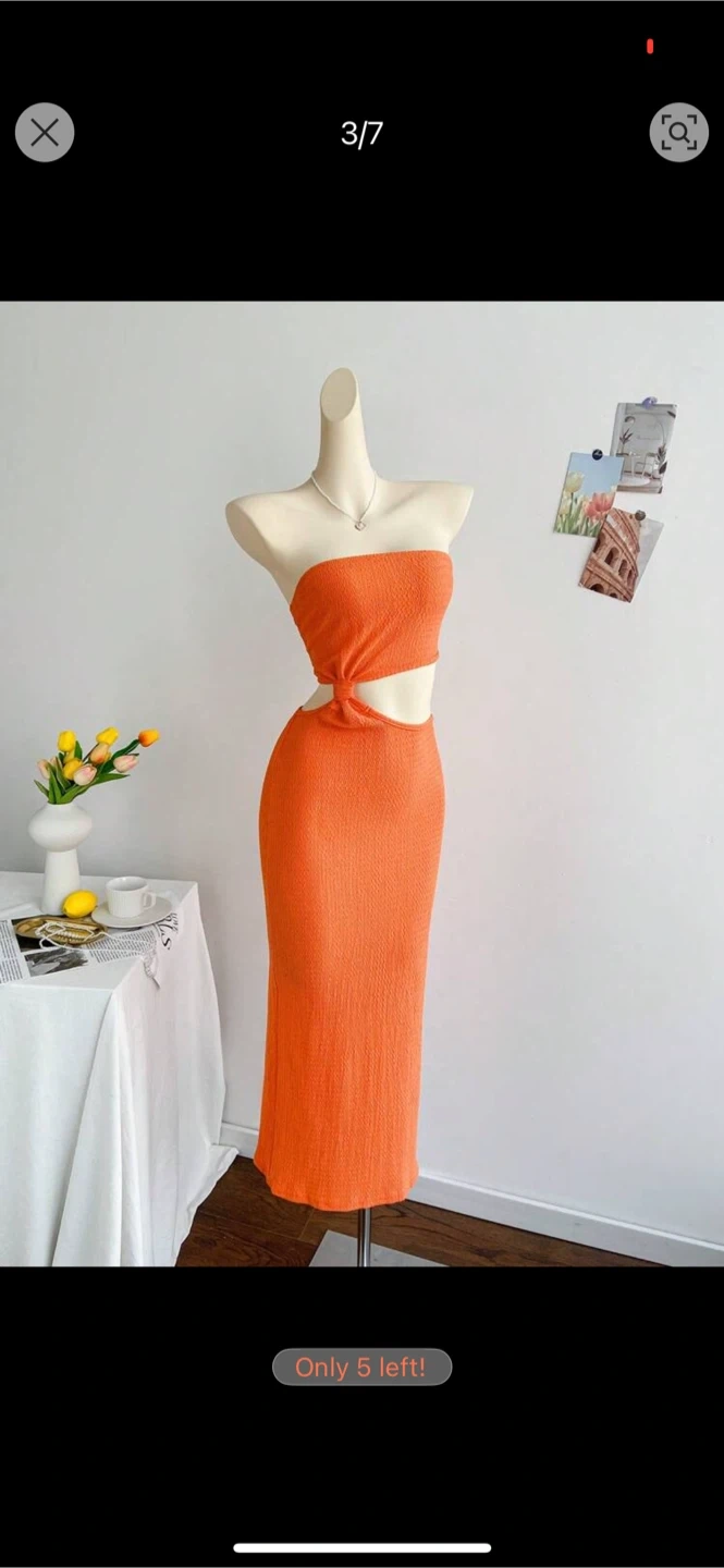 435This is a stunning orange cutout knit dress that's perfect for a night out or a special occasion. It features a unique cutout design at the waist, adding a touch of sophistication to the overall look. The knit material is comfortable and flattering, making it a great addition to your wardrobe