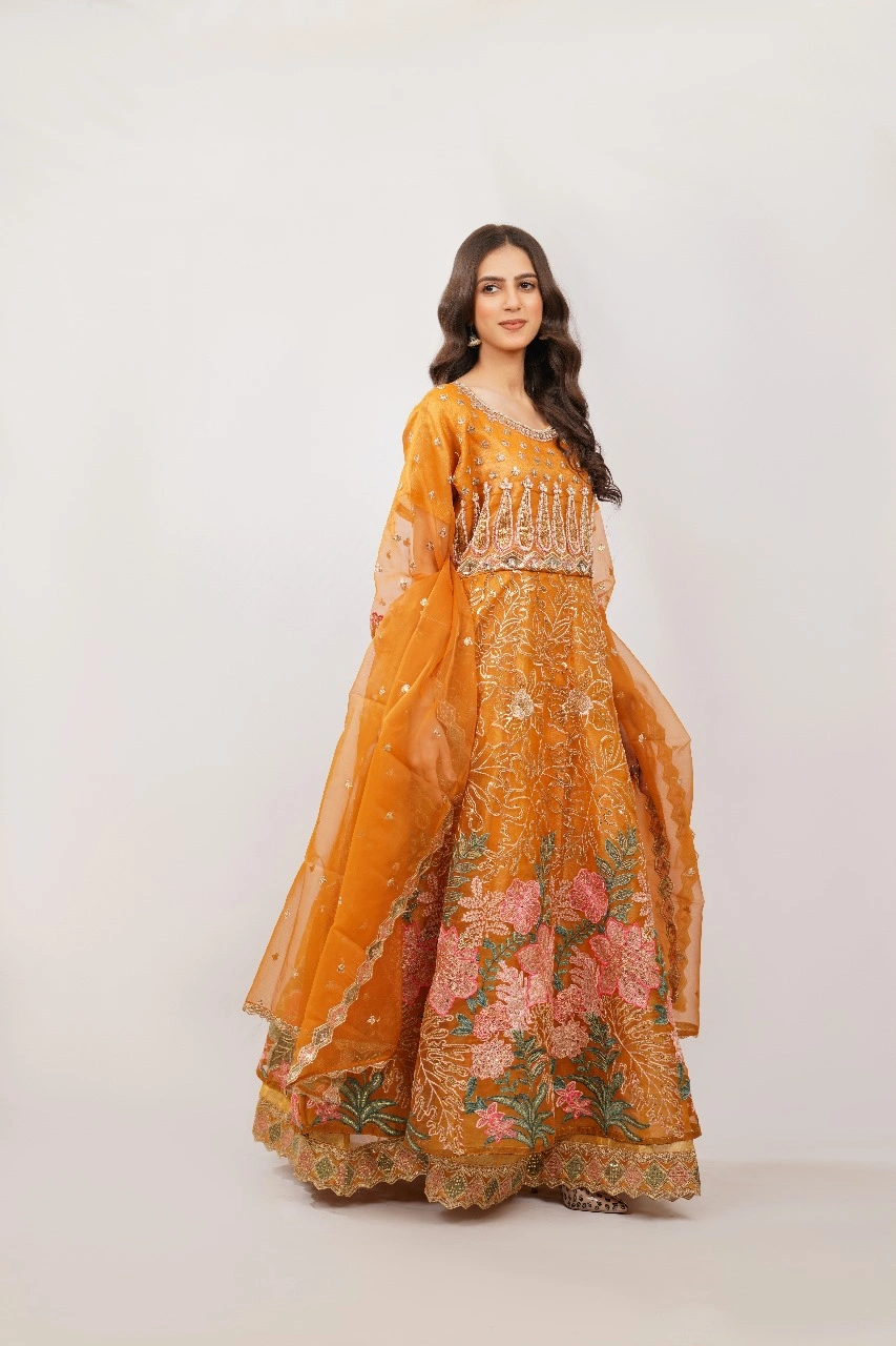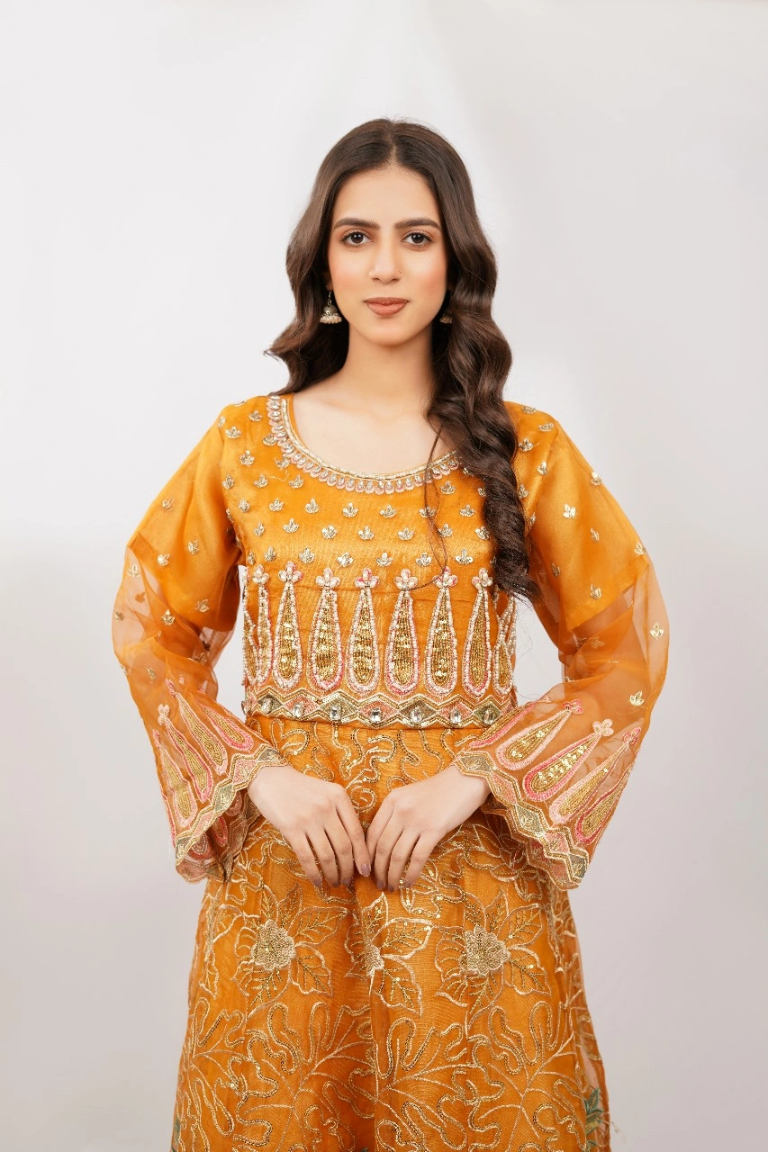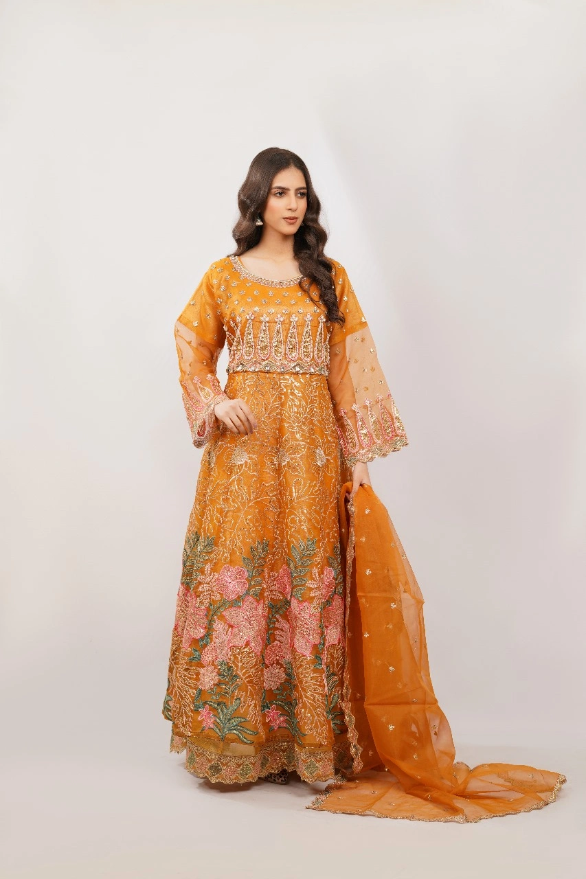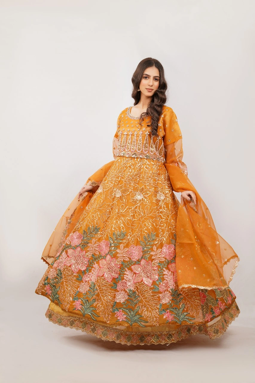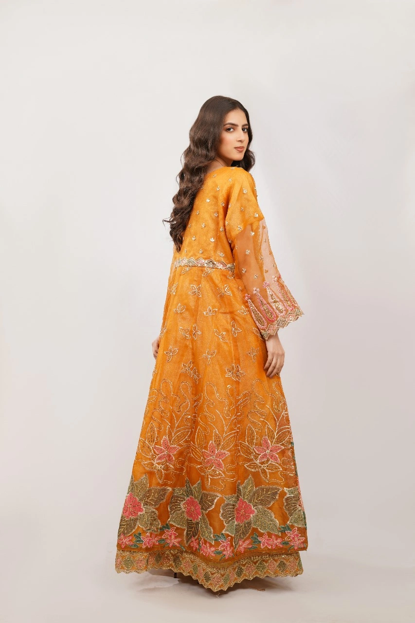 60Beautiful orange formal dress with intricate embroidery and sheer sleeves. Perfect for special occasions or events.