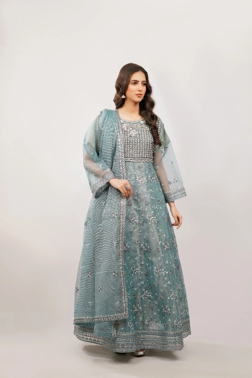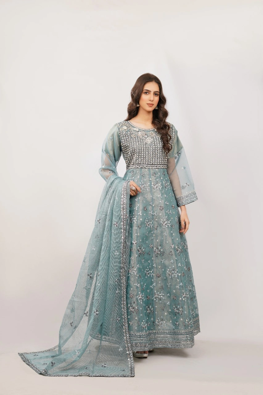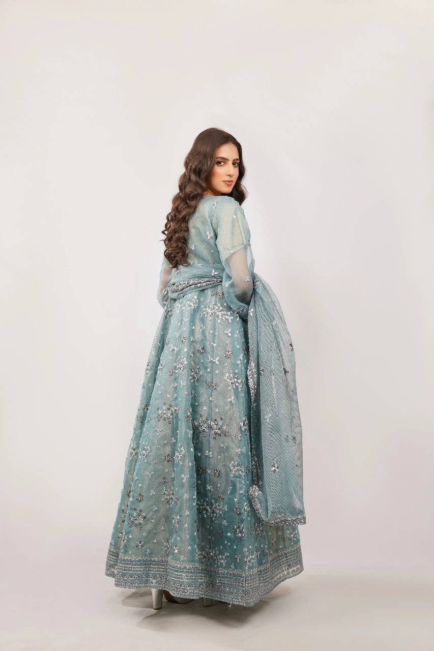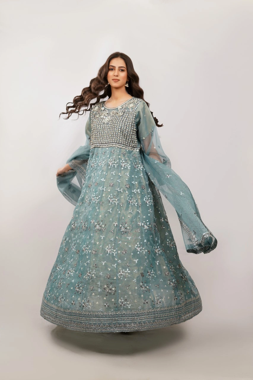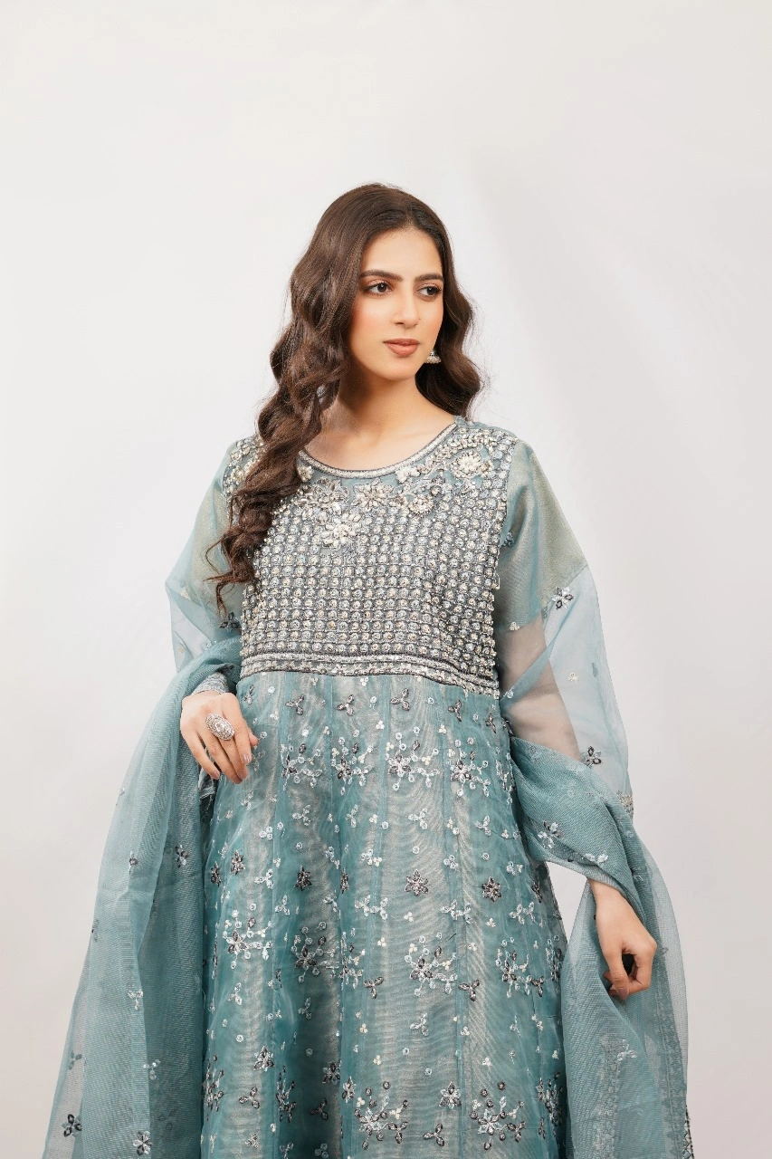 60Beautiful orange formal dress with intricate embroidery and sheer sleeves. Perfect for special occasions or events.