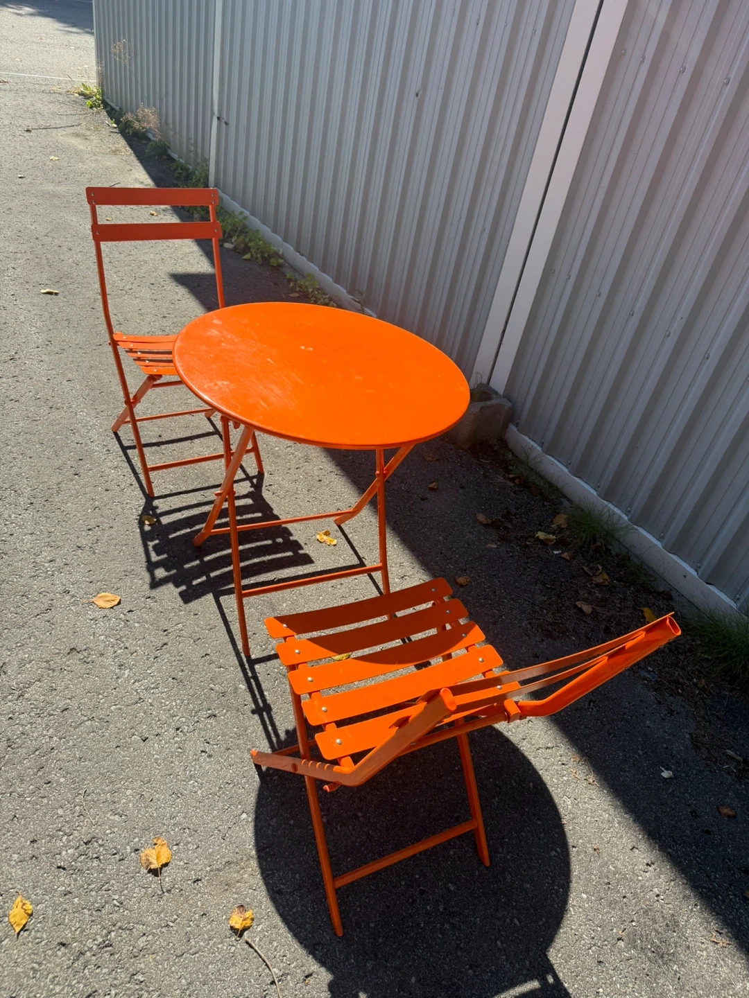 Looking to add a pop of colour to your patio or balcony? This bright orange bistro set is perfect! It includes a round table and two matching chairs. Great for enjoying your morning coffee or a cozy evening meal. The set is in good condition and ready for a new home!