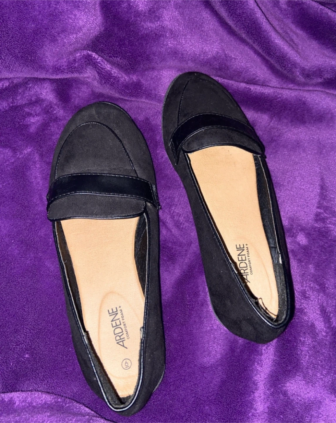 Step out in style with these gently worn Ardene black loafers, a classic and versatile addition to any wardrobe. These feature a sleek faux suede finish and a comfortable slip-on design, perfect for both casual and semi-formal occasions.