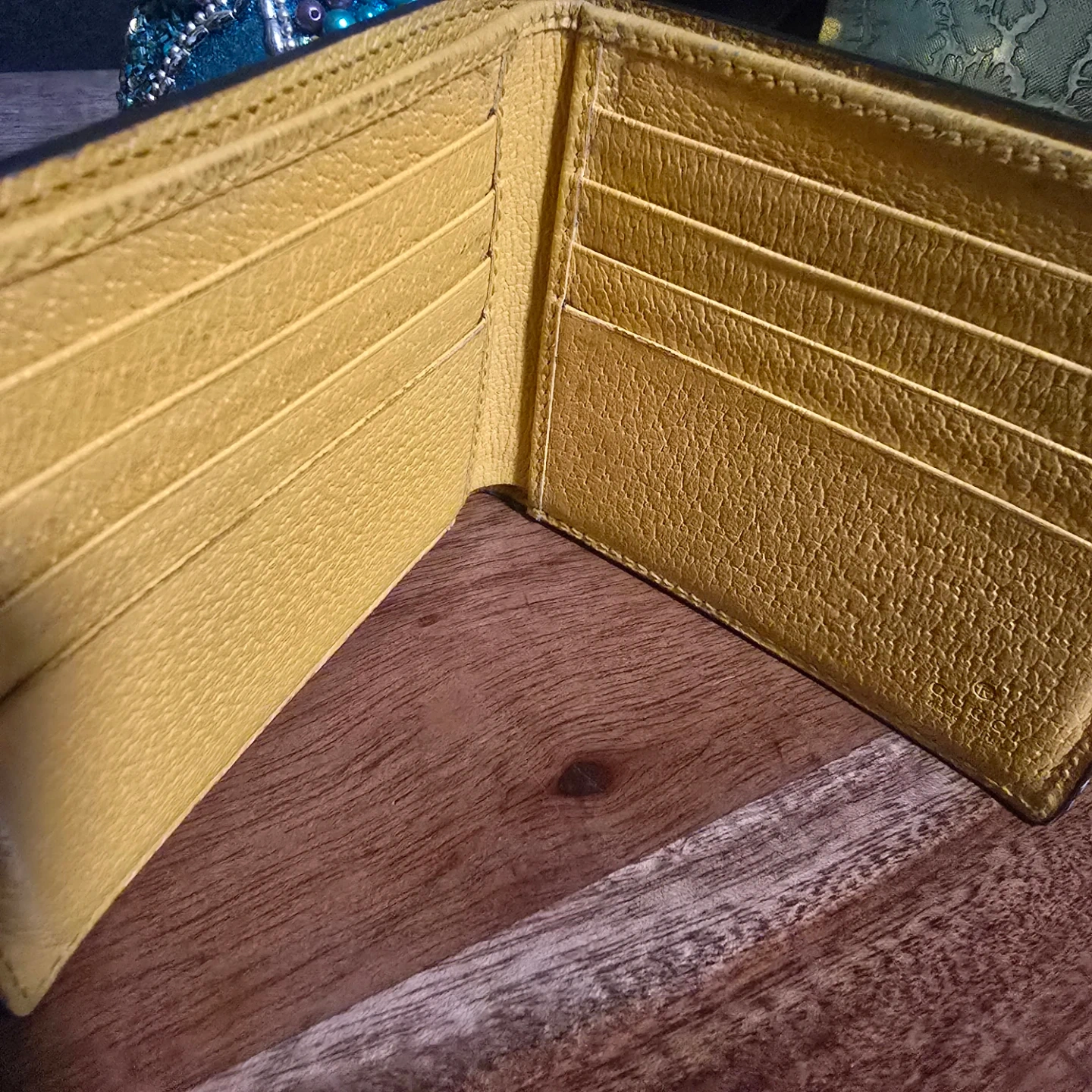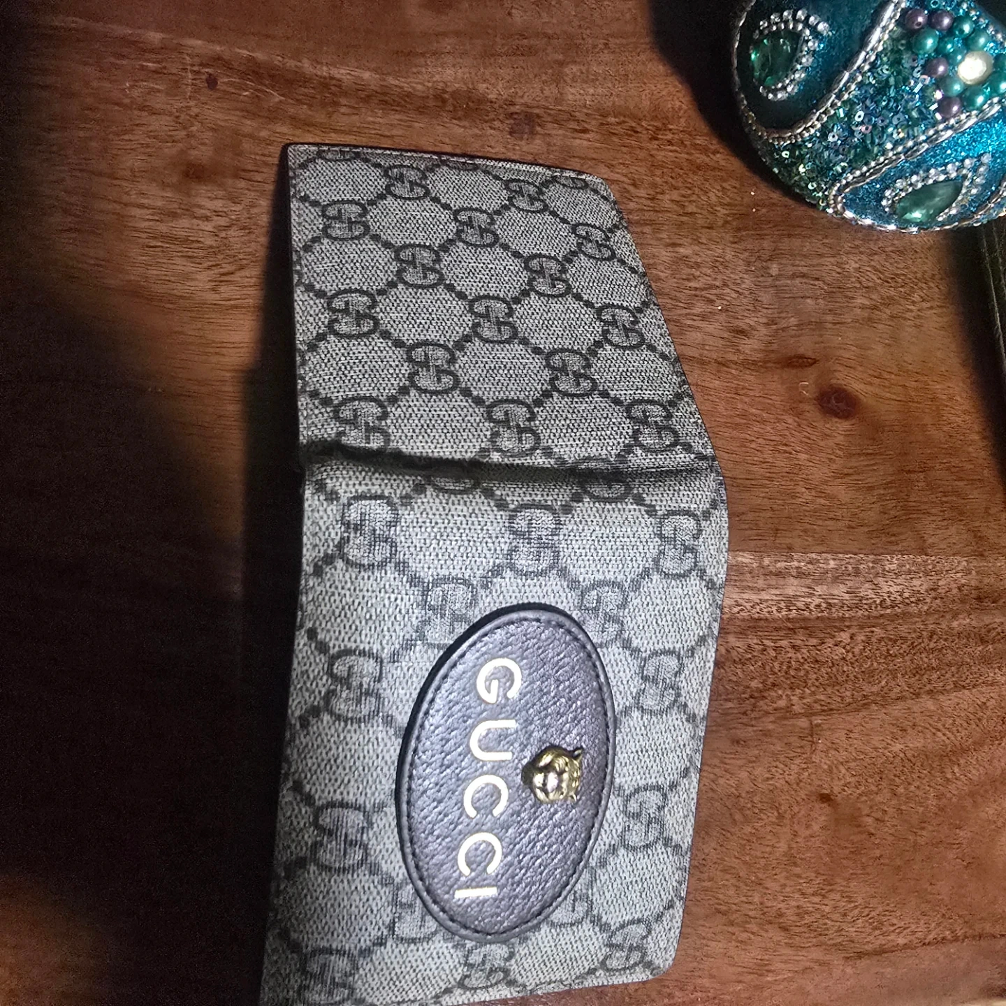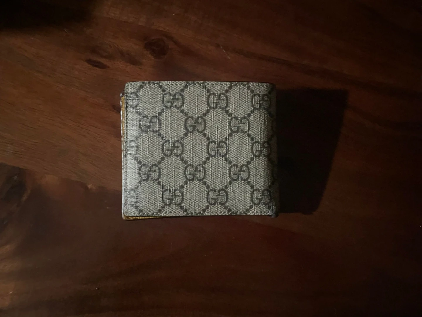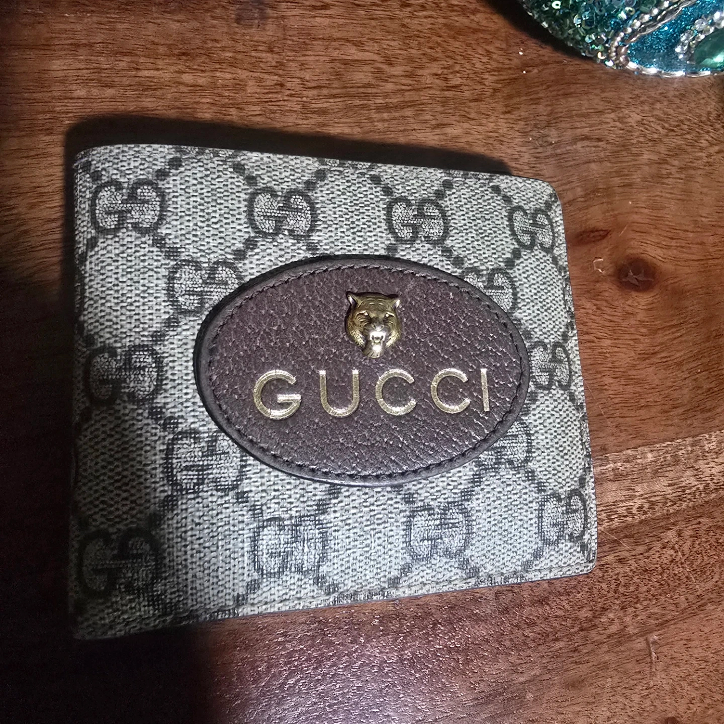 This is a GUCCI GG Supreme bi-fold wallet. It features the iconic GG pattern and a brown leather oval with a tiger head emblem. Interior has multiple card slots and a bill compartment.