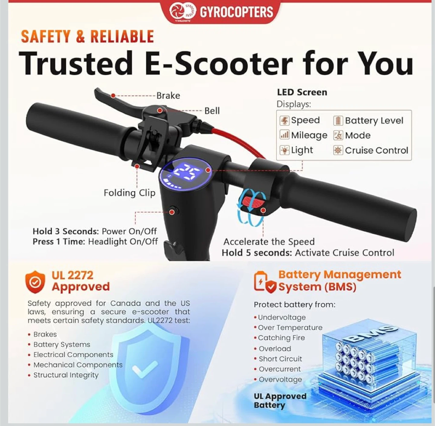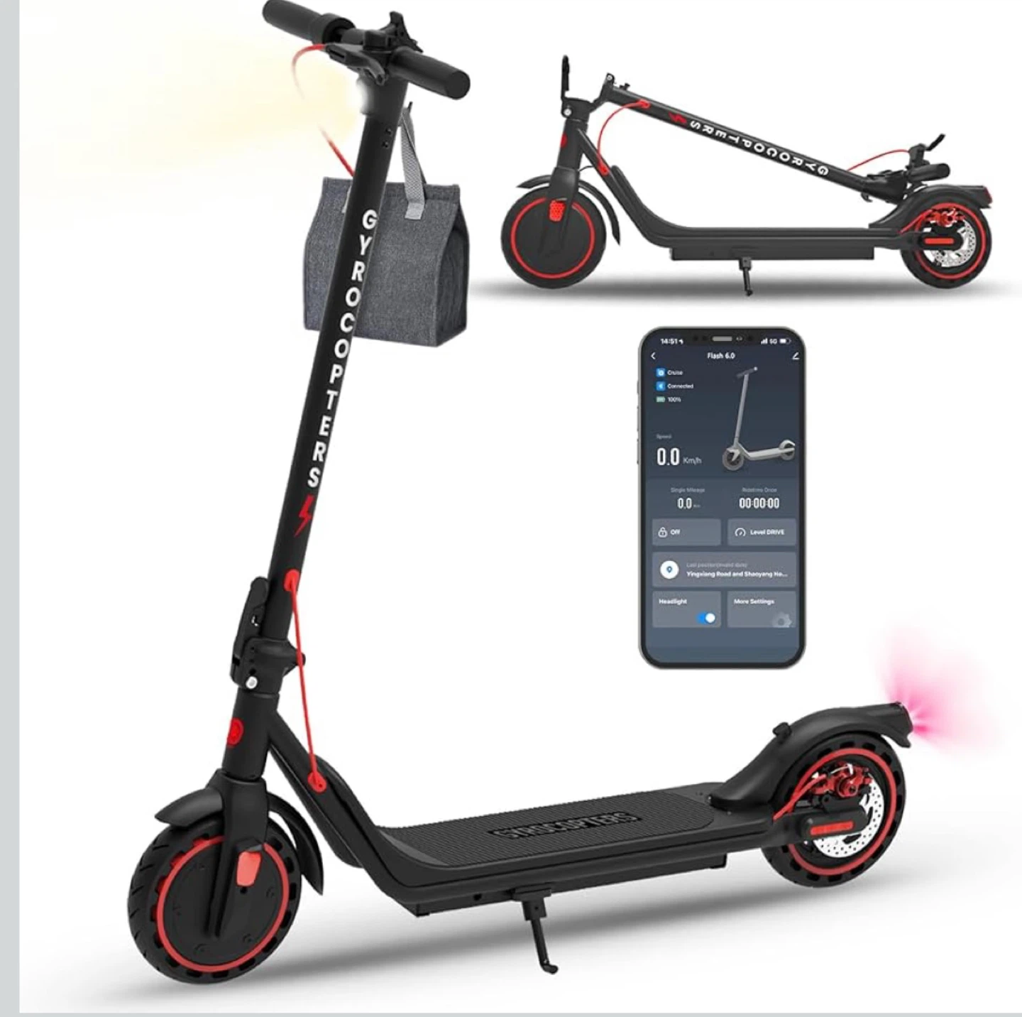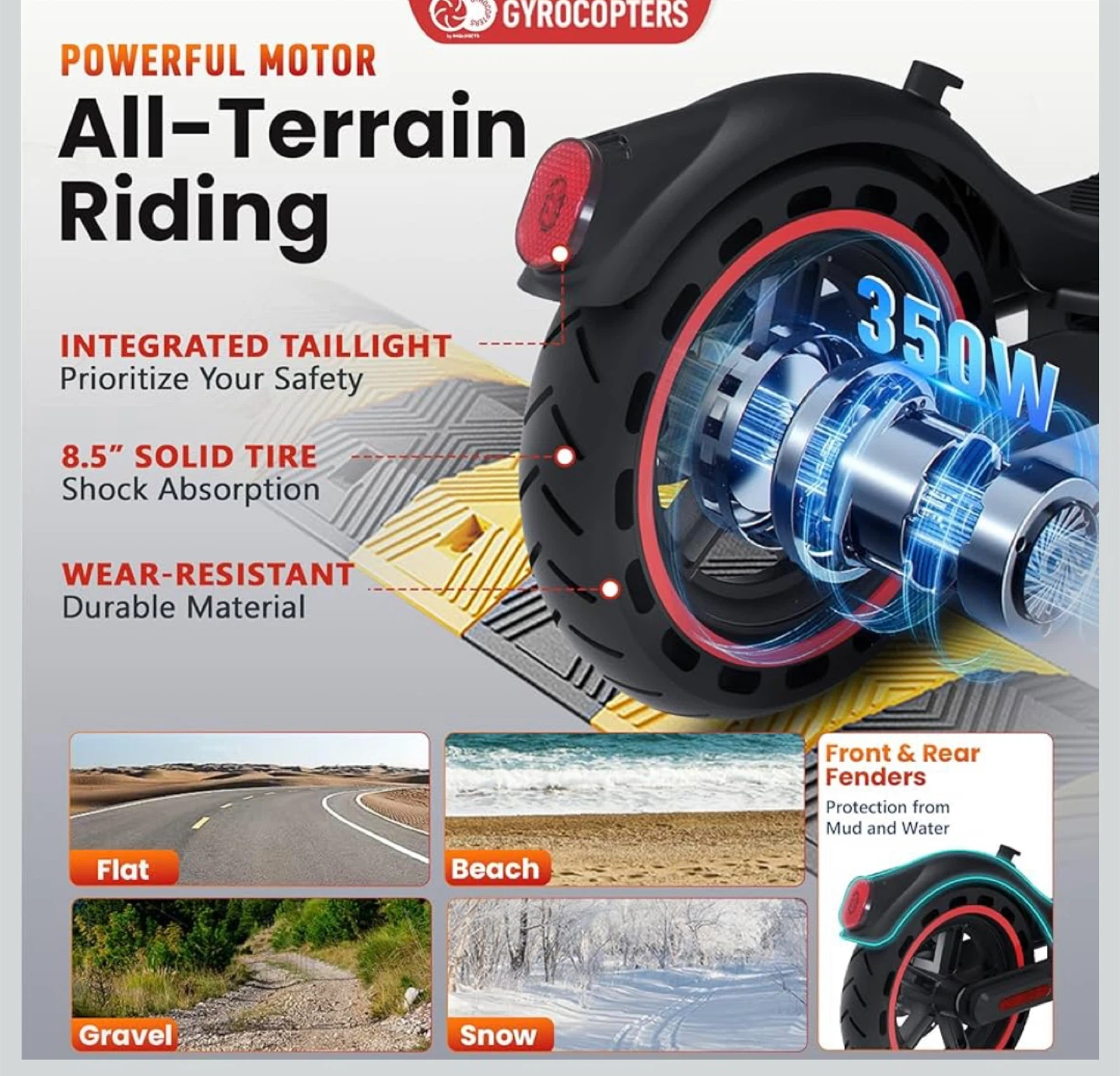 maximum speed 30 km/h This GYROCOPTERS electric scooter features a powerful 350W motor for all-terrain riding. It has 8.5" solid tires for shock absorption and is UL 2272 approved. The LED screen displays speed, mileage, and battery level. Front and rear fenders offer protection from mud and water.