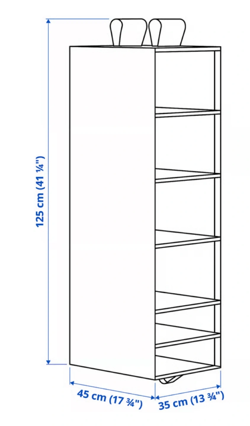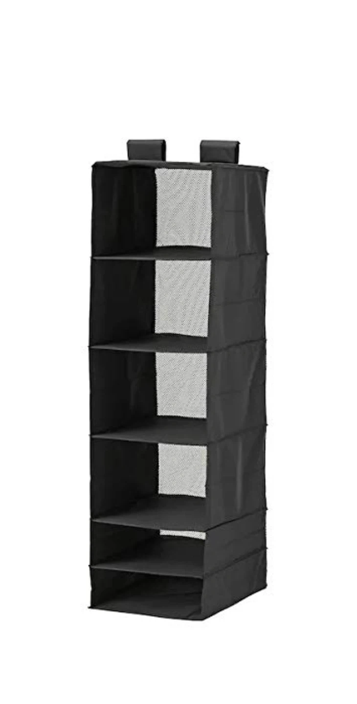 Looking to organize your closet? This hanging storage unit is perfect for keeping your clothes, shoes, or accessories neat and tidy. It features 6 compartments and is easy to hang in any wardrobe. The dimensions are approximately 125 cm (41 1/4") in height, 45 cm (17 3/4") in width, and 35 cm (13 3/4") in depth. Opened, however not used. New Product.