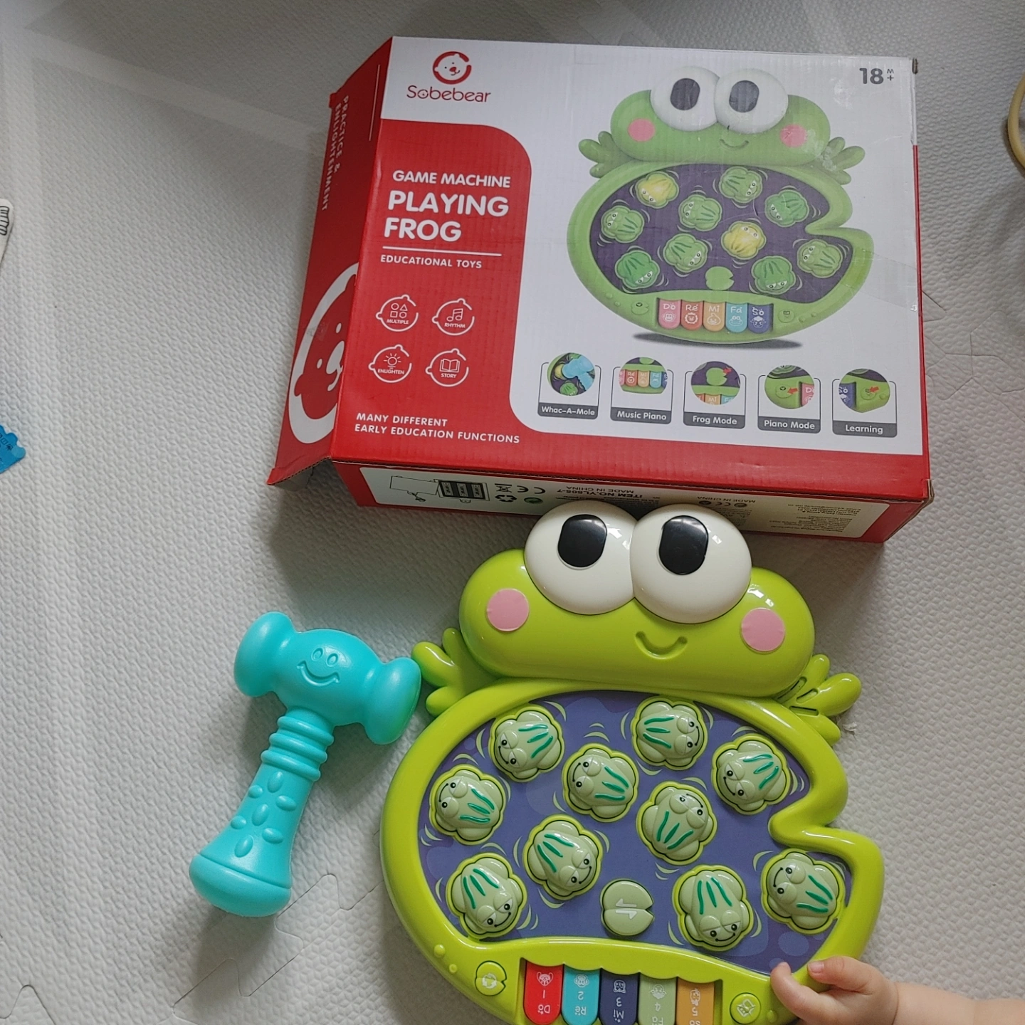 Interactive toy frog. Features multiple game modes: whack-a-mole, music piano, frog mode, piano mode, and learning. Includes a small hammer. Educational toy for early childhood development.
