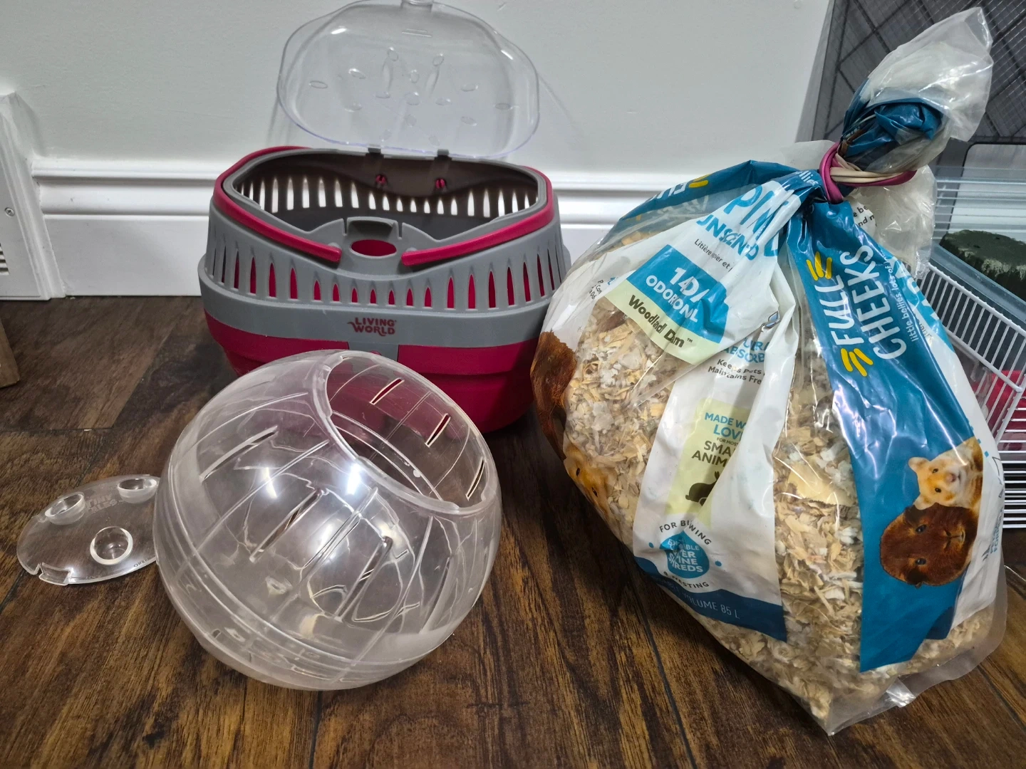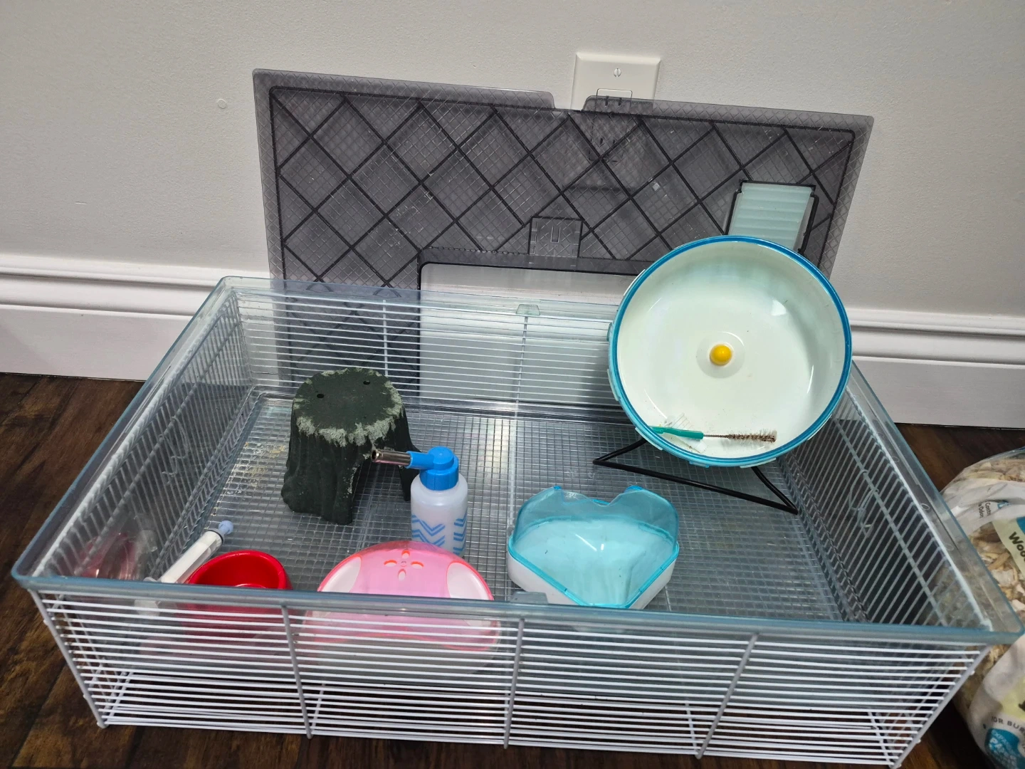 Includes a large wire hamster cage with wheel, water bottle, and hideouts. Also comes with a carrier, a large exercise ball, and a nearly full bag of wood-based hamster bedding. Everything your small pet needs to get started!
