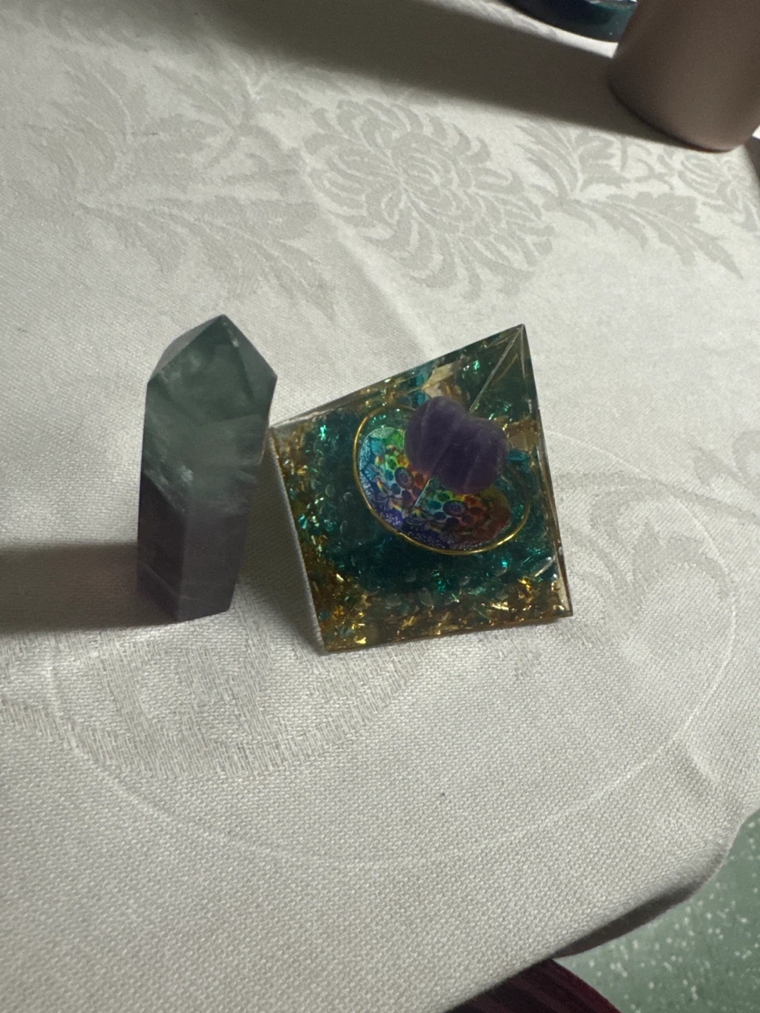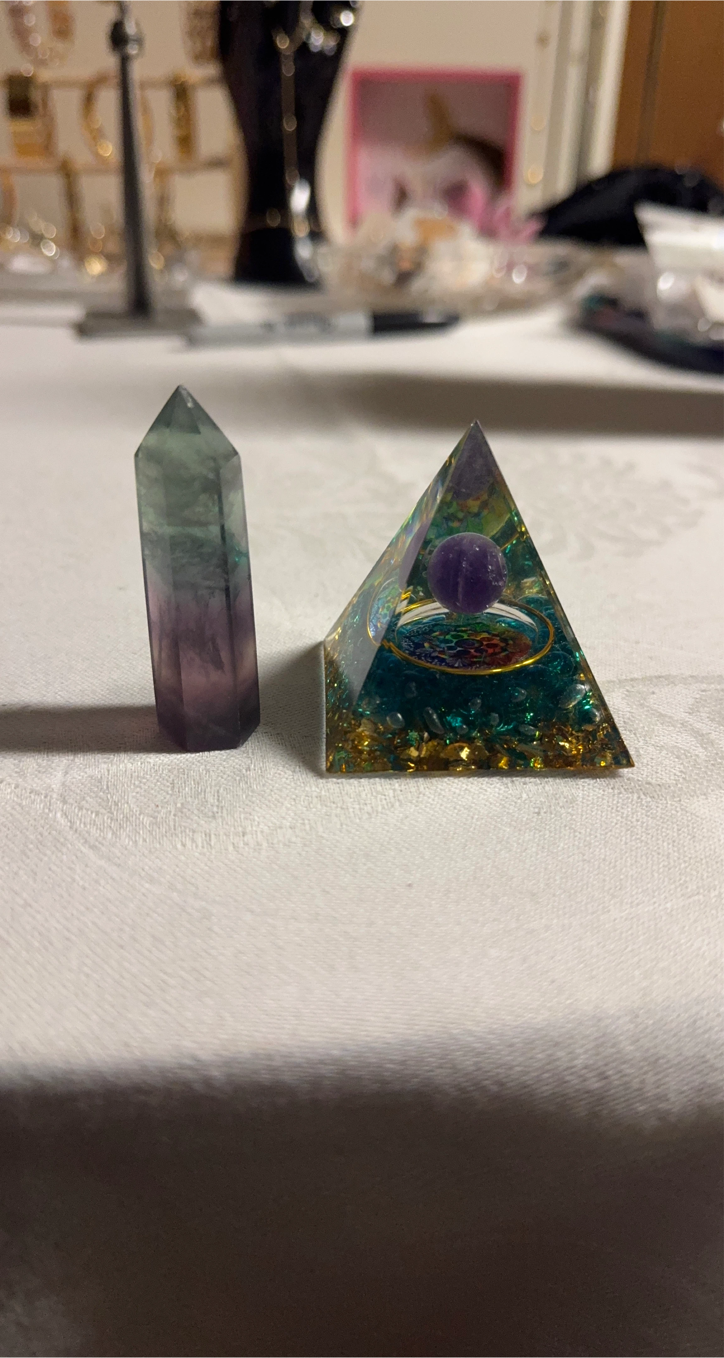 22Selling a beautiful orgone pyramid and a fluorite crystal point. The pyramid is filled with various crystals and metals, and the fluorite point has lovely colour variations. Great for meditation or just as a decorative piece!