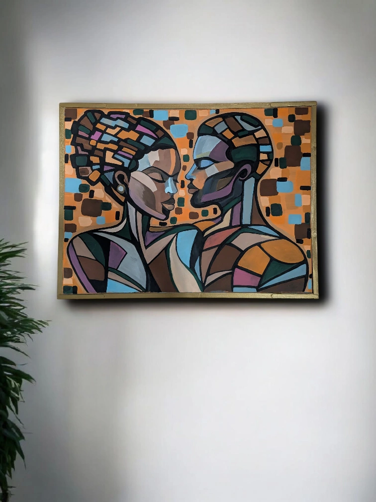 Original Abstract Cubist Portrait Painting: "Harmony" This striking original acrylic painting on canvas captures a moment of intimate connection and profound beauty. Featuring two figures rendered in a captivating abstract and cubist style, this artwork is a true statement piece for any modern home or collection. Unique Style: The figures are composed of bold, geometric shapes and planes of color, creating a rich, textured, and mosaic-like effect reminiscent of Cubism with a contemporary twist. Vibrant Palette: The painting uses a warm, earthy color scheme dominated by shades of orange, rust, brown, teal, and soft lavender, set against an intricate, dappled background that enhances the depth and energy of the piece. Intimate Subject: The close proximity and closed eyes of the figures evoke feelings of harmony, love, and serene unity. Ready to Display: The canvas is beautifully framed in a slim gold-tone frame, providing a polished and elegant finish. Perfect Decor: A fantastic focal point for a living room, bedroom, or office. It is sure to start conversations and add an element of sophisticated, cultural flair.