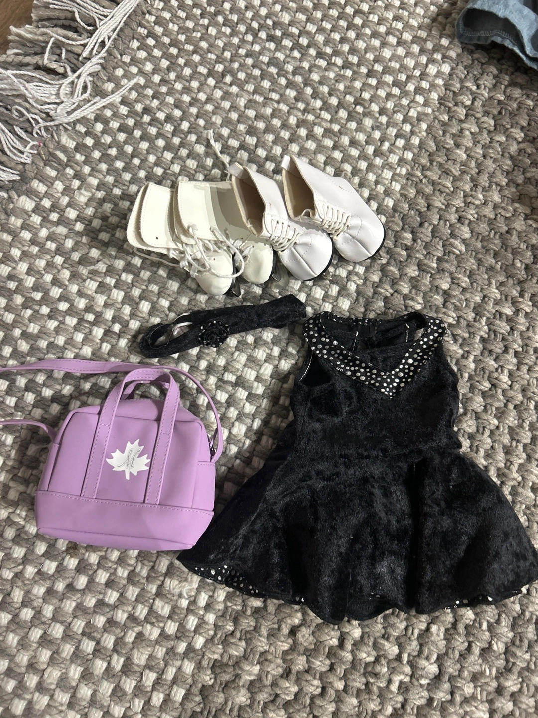 Two pairs of skates Black ice skating dress Black matching head piece Purple shoulder bag