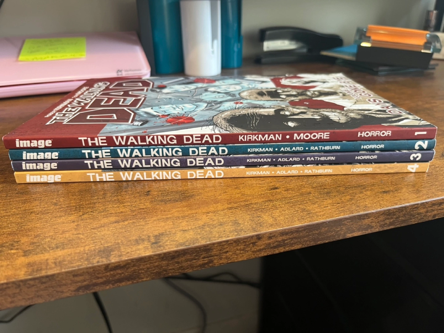49Brand new never read, spine never cracked, first four original walking dead comics. Purchased 15 years ago for $20 each (so $80 for the 4) selling for $40. Pick up only please and no holds. Burnhamthorpe and central parkway area.