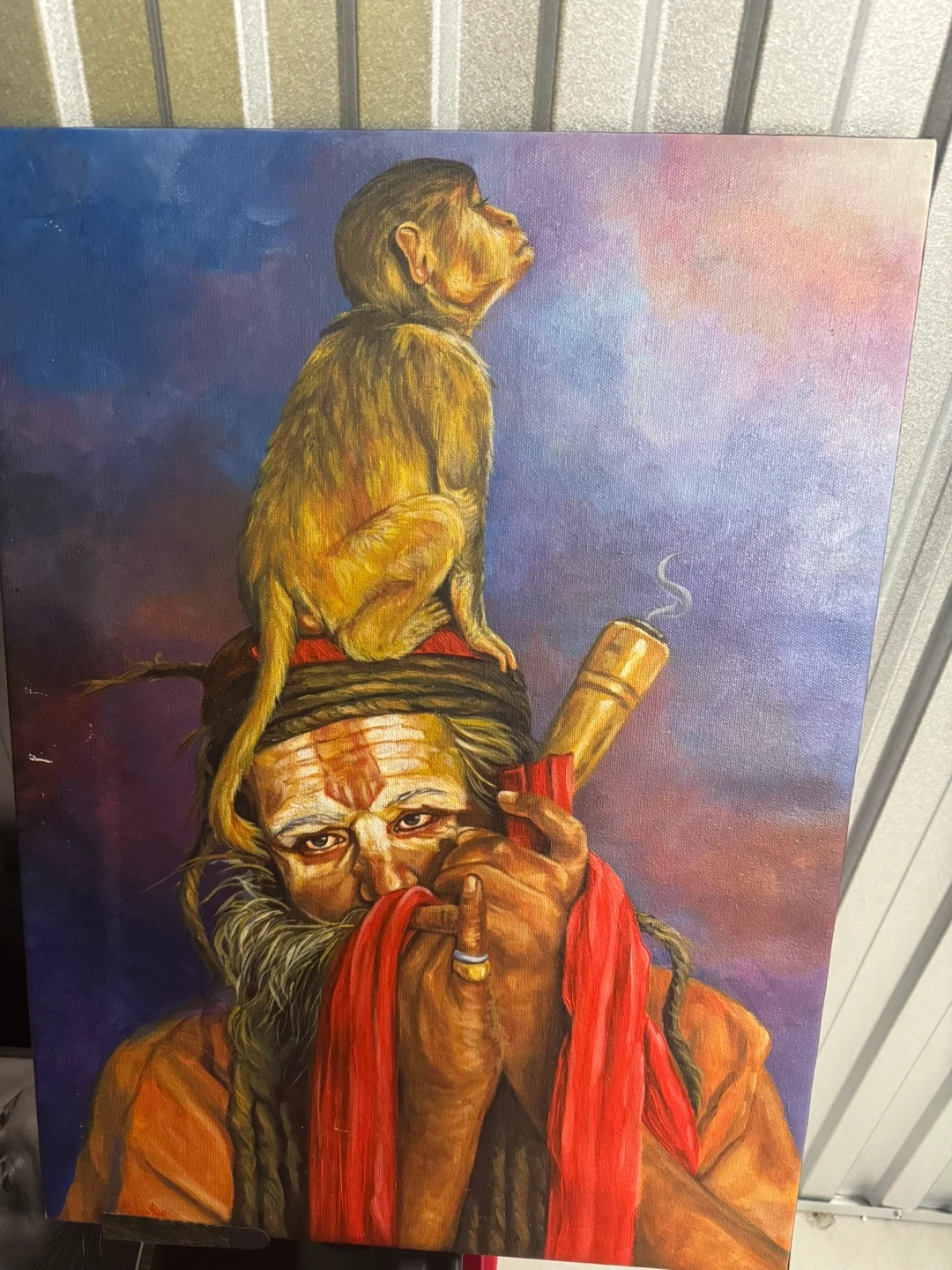 80Original oil painting on canvas. Features a man with a monkey on his head. The painting is in good condition and ready to hang
