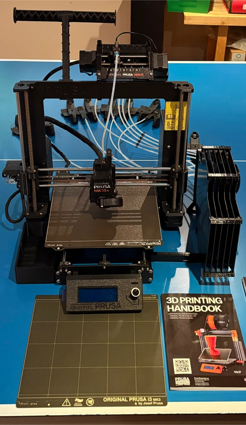 Selling my Original Prusa MK3S+ with MMU3 (Multi-Material Unit). • Printer condition: Works well in single-material mode, prints reliably, but shows normal wear from 3 years of use. Recently had the heater cartridge replaced, so the hotend is ready to go. • MMU3 condition: Included, but may need some tuning or recalibration — occasionally misfeeds filament. Good project for someone who wants multi-material printing. 🔧 What’s Included: • Prusa MK3S+ 3D printer (fully assembled) • Prusa MMU3 unit with filament buffer and PTFE tubes • SD card, spool holder, Smooth Heatbed Steel Sheet, Textured Powder Coated Heatbed Sheet • Printer Handbook ✅ Notes: • Printer prints reliably in single-material mode • MMU3 works but may require tinkering • Normal cosmetic wear (scuffs, minor scratches) • Always stored in a clean, smoke-free environment This setup is perfect if you want a reliable MK3S+ right away and an MMU3 for future multi-material projects.