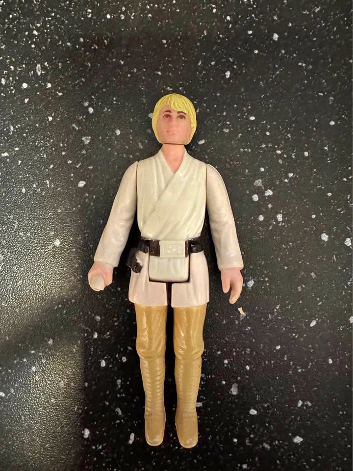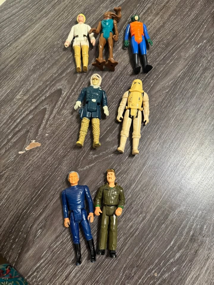 60These are original, first run figures. Perfect gift for a Star Wars fan collection. I’ve included pictures of the manufacturers date stamp. Original 1977 Luke Skywalker “Farm Boy Luke” (Without saber) Original 1977 Hammerhead (Perfect eye paint) Original 1978 Walrus Man Aka “Ponda Baba” Original 1980 Han Solo “Hoth Battle Gear” Original 1980 Imperial Stormtrooper “Hoth Battlegear Snowtrooper” Original 1980 Darth Vader figure case *Bonus Original 1978 Commander Adama Battlestar Galactica & 1970’ Tonka figure
