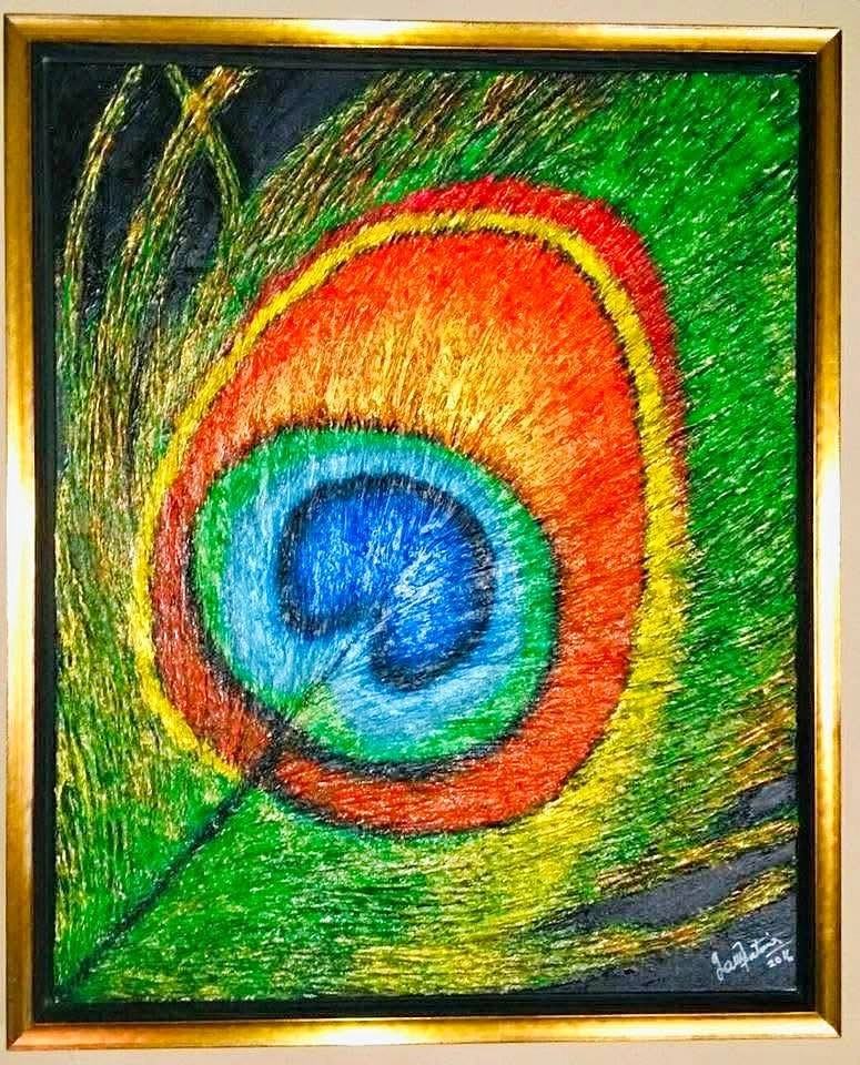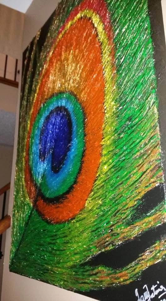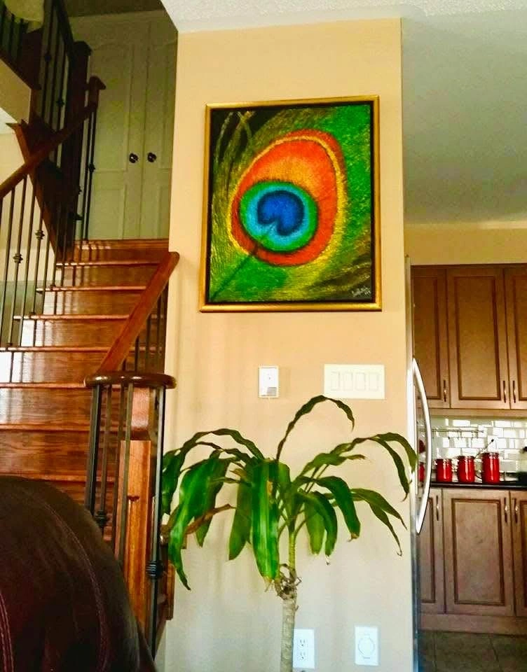 Original oil painting, fully textured handmade peacock feather painting with customized framing from Michael for $400+. Varnished. Size 27”x33” with frame. Only of $450 obo.