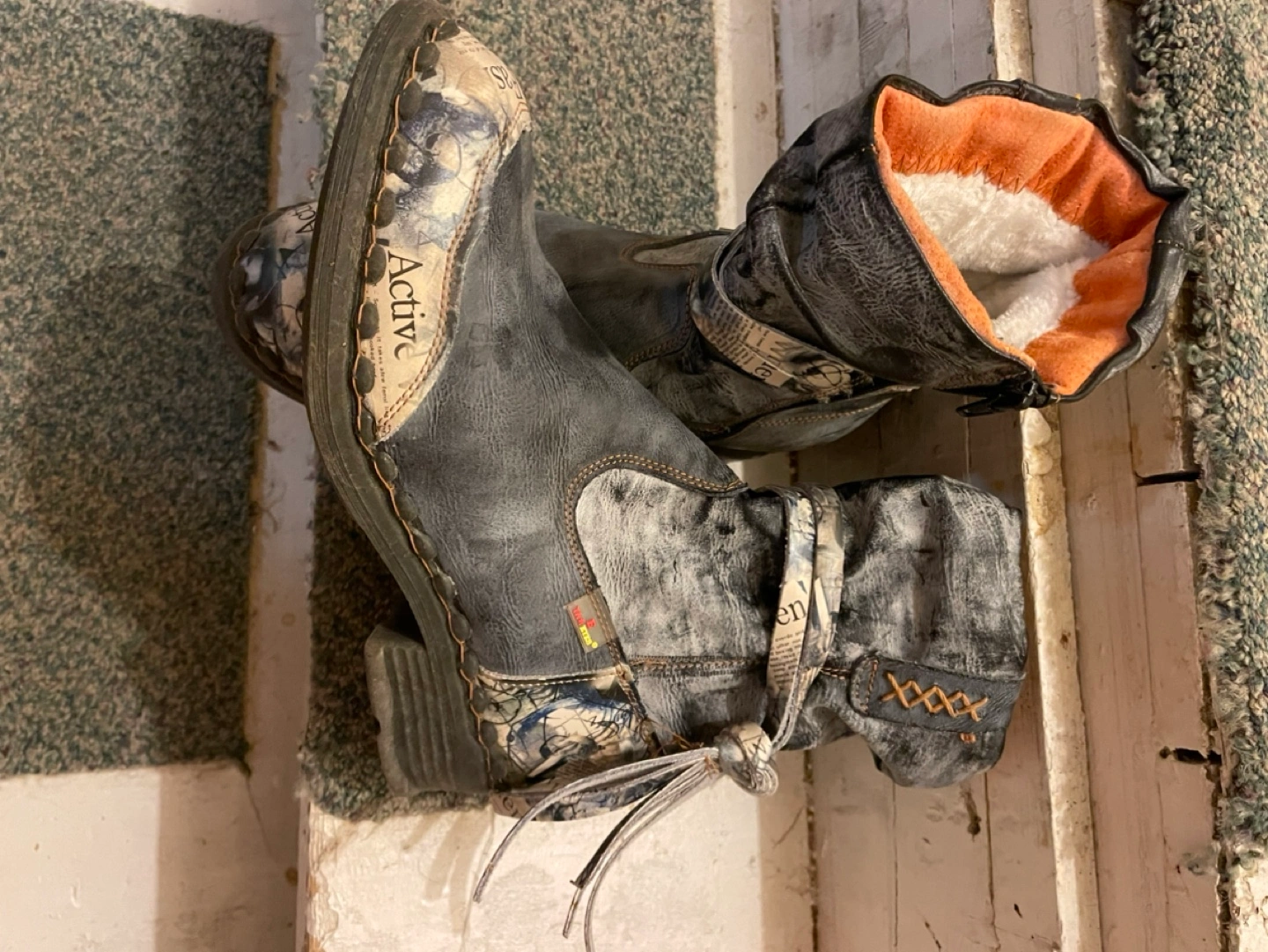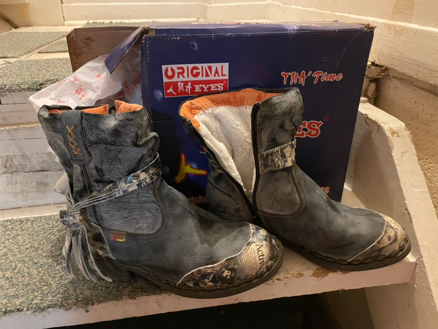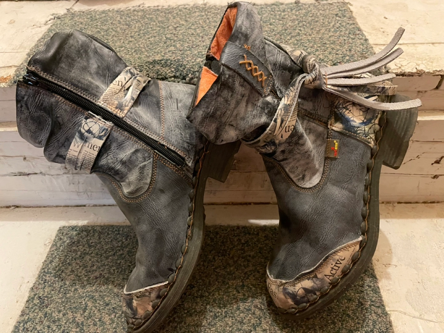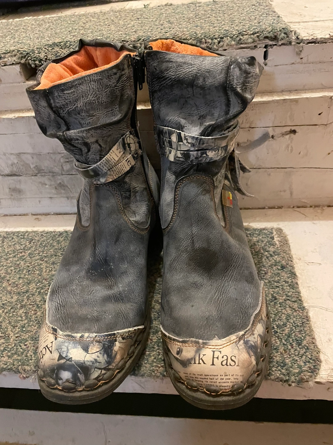 TMA EYES Women's leather boots, worn twice - distressed blue/grey and black with a 1” heel, newspaper print design, fancy straps, side zipper closure, plus thick faux fur lining. PU 1980 Victoria park ave unit 1, nth Lawrence