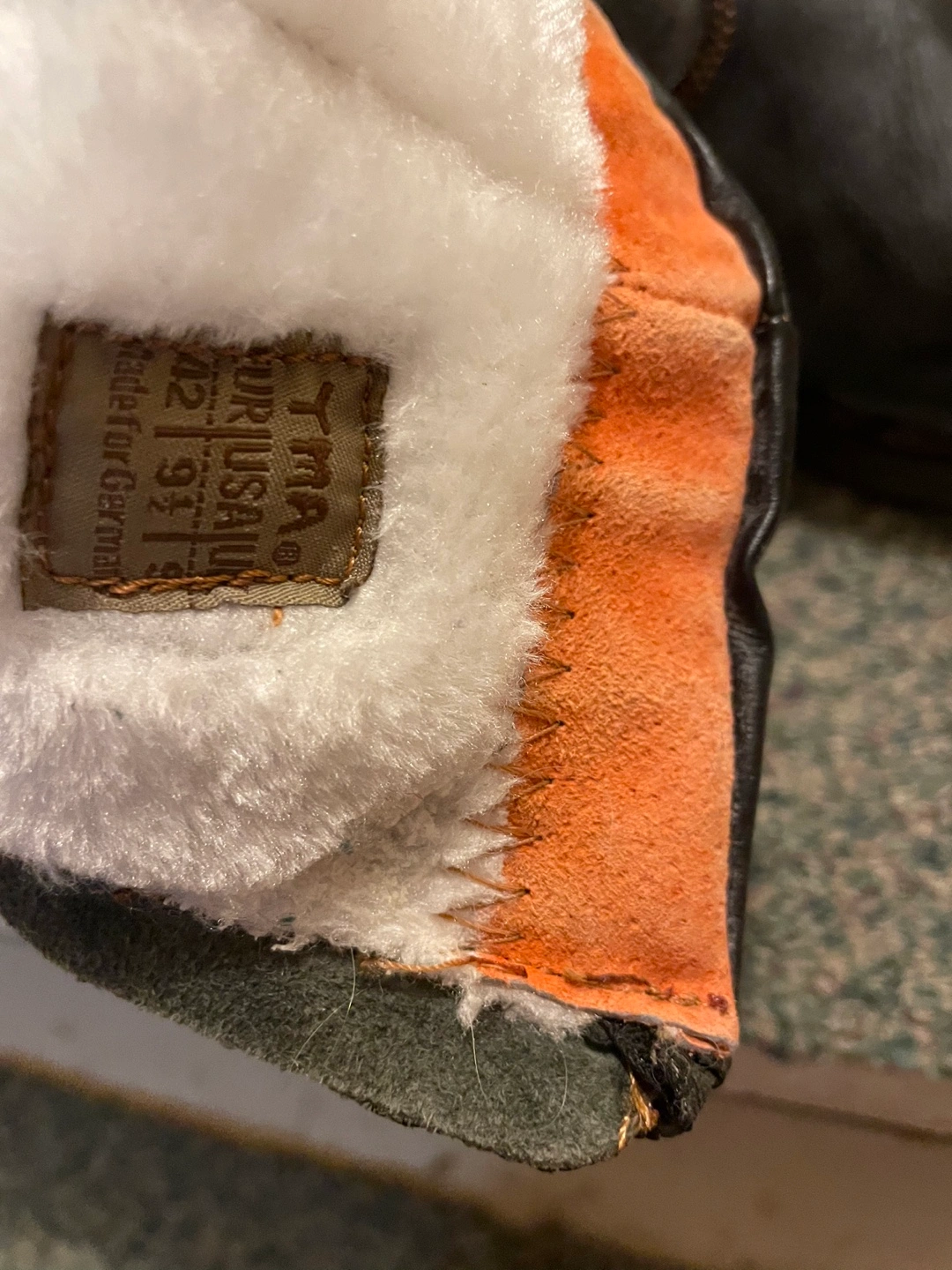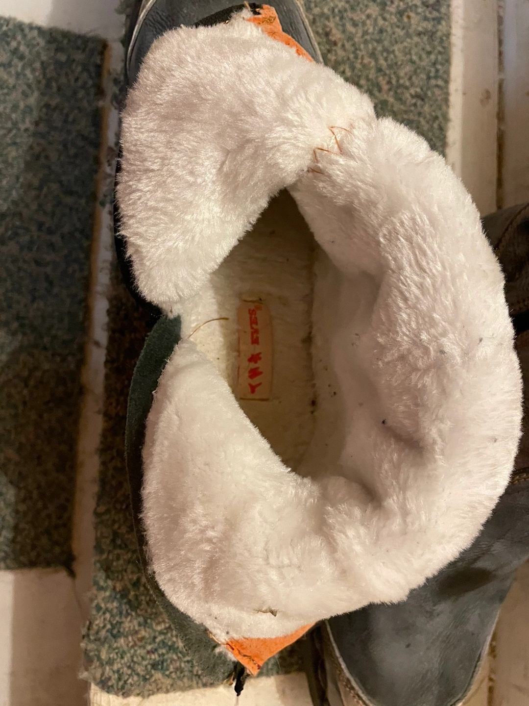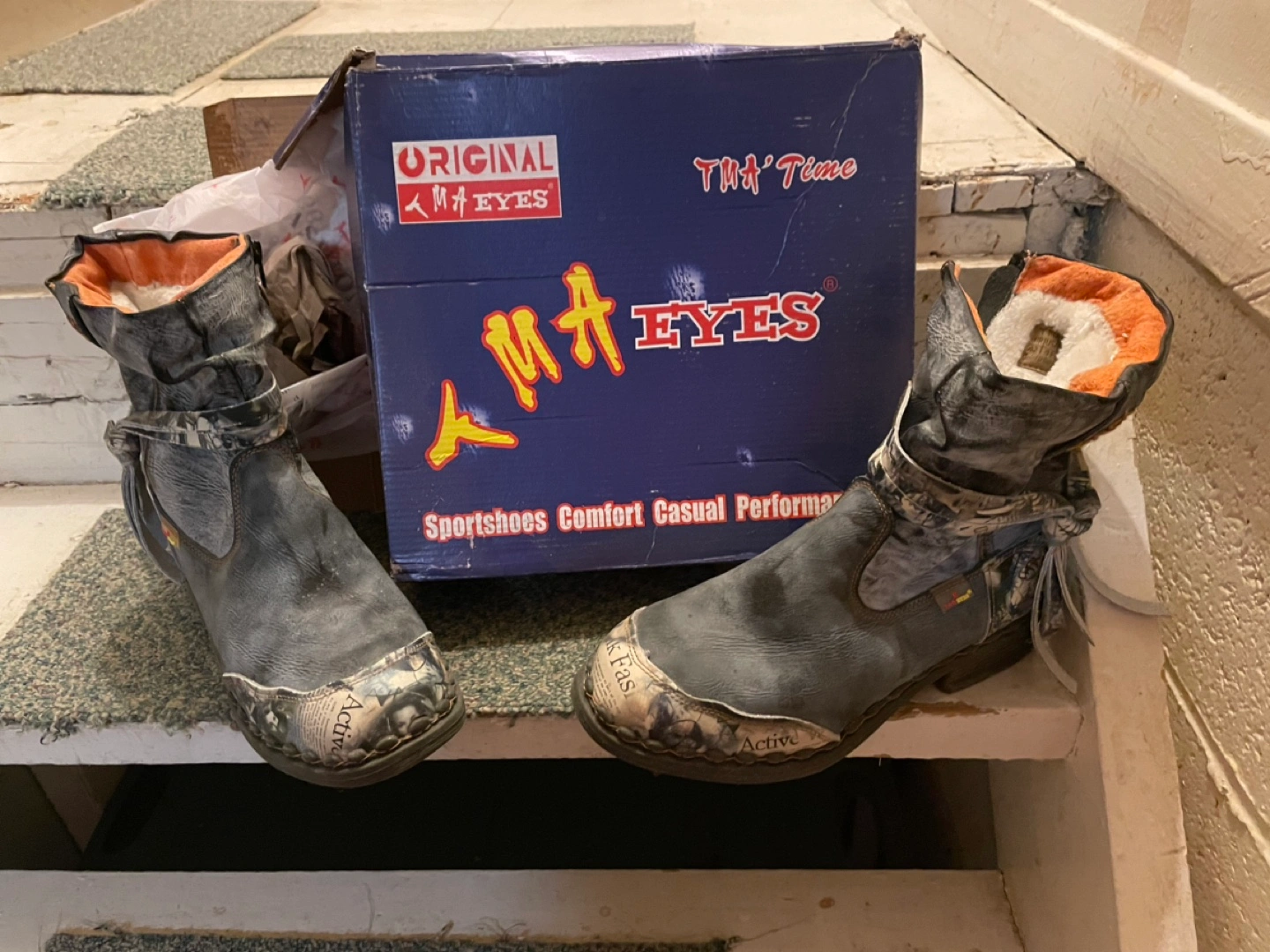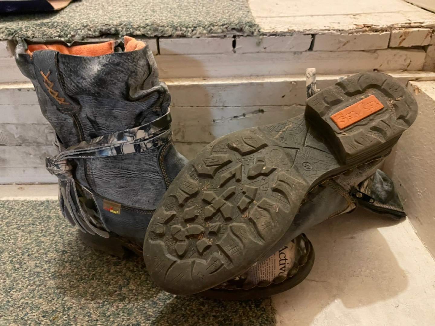 TMA EYES Women's leather boots, worn twice - distressed blue/grey and black with a 1” heel, newspaper print design, fancy straps, side zipper closure, plus thick faux fur lining. PU 1980 Victoria park ave unit 1, nth Lawrence