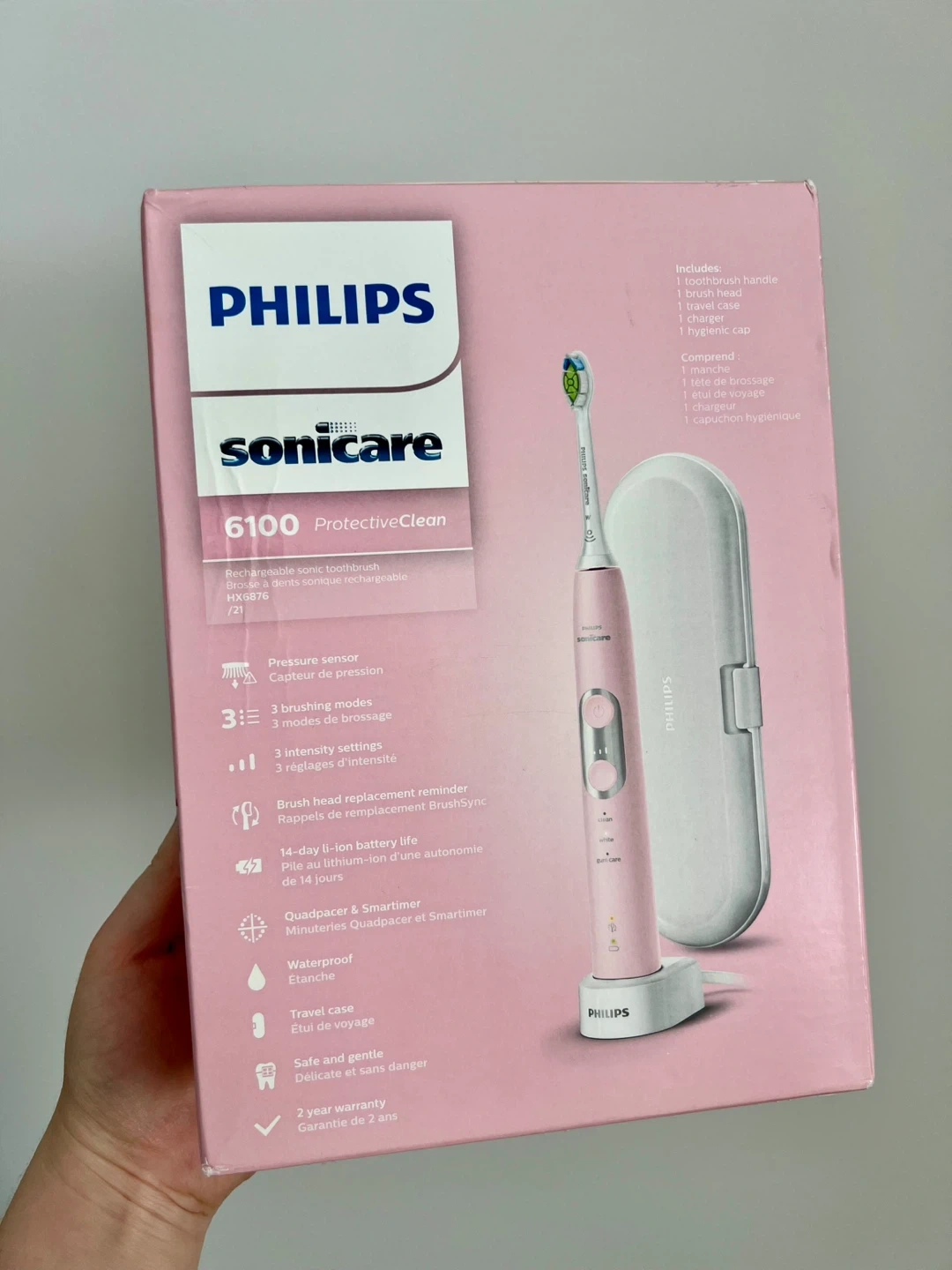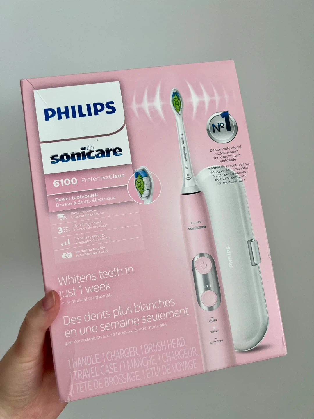 Selling a New in Box Philips Sonicare 6100 ProtectiveClean toothbrush in pink! It comes with the box and includes the toothbrush handle, one brush head, a travel case, and the charger. Originally bought for $180. This toothbrush features: - Pressure sensor - 3 brushing modes - 3 intensity settings - Brush head replacement reminder - 14-day battery life - Waterproof design Perfect gift, never opened, brand new