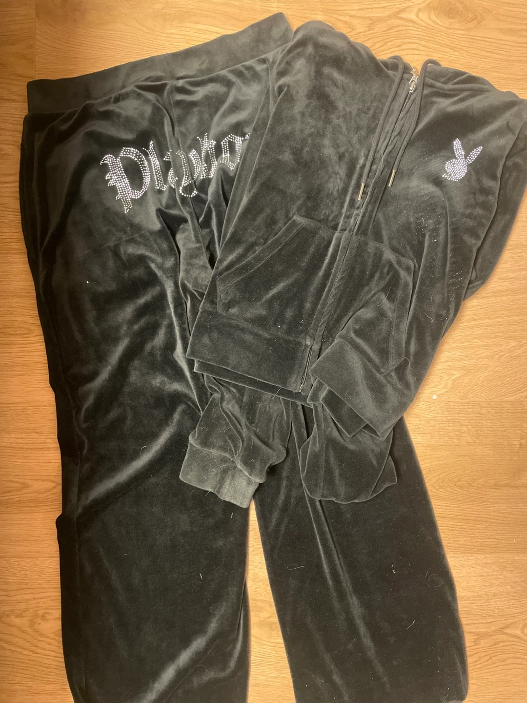 This is a Playboy tracksuit set. It includes a zip-up hoodie and matching pants. Both pieces are black and have rhinestone embellishments.