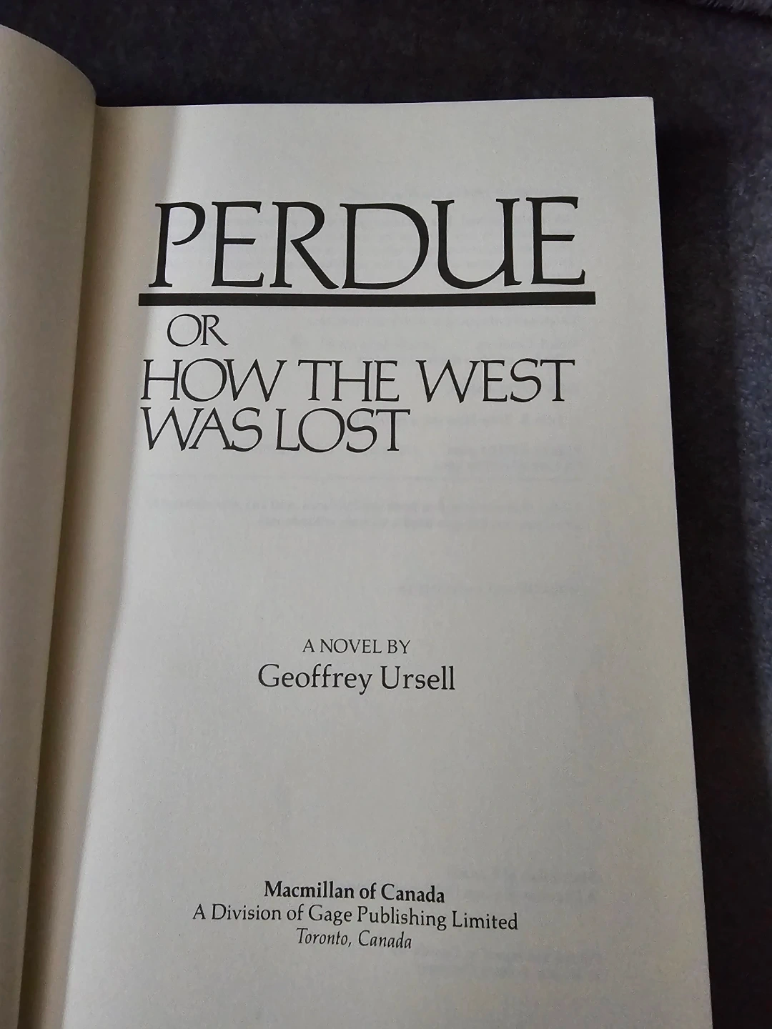 Perdue or How the West Was Lost is a novel by Geoffrey Ursell. This hardcover edition was printed and bound in Canada by T. H. Best Printing Company. Copyright is from 1984.