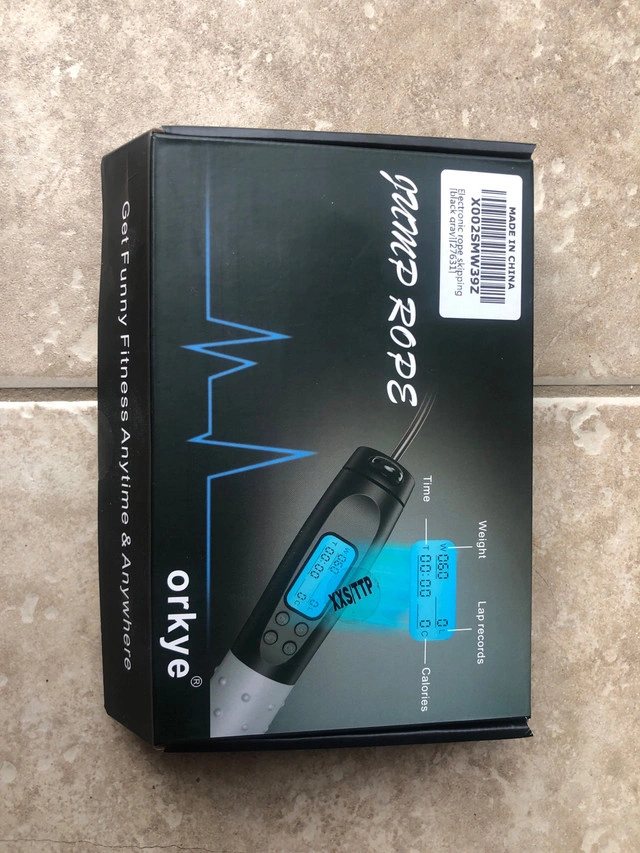 10Get your heart pumping with this Orkye jump rope, perfect for fitness enthusiasts of all levels! This digital weighted speed jumping rope is designed to help you track your progress with its built-in counter, timer and calorie tracker. It's in new condition, never been used.