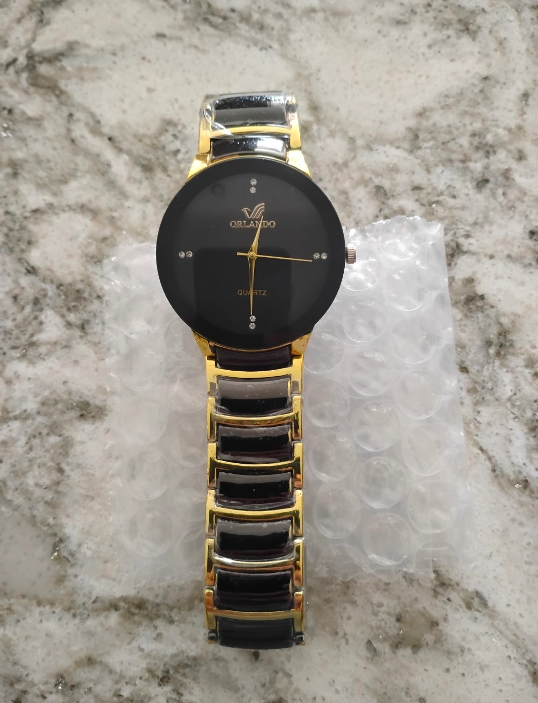 Selling an Orlando Quartz watch with a stylish gold and black band. It's in great shape and ready for a new wrist! The watch face is black with gold hands and small diamond-like accents. A nice addition to any outfit