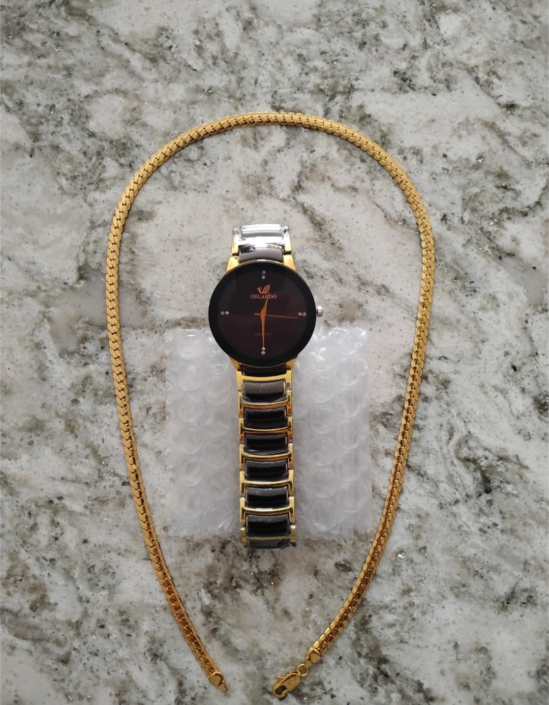 Selling a stylish Orlando quartz watch with a gold and silver band, paired with a beautiful gold chain. The watch has a sleek black face and is in great condition. Perfect for adding a touch of elegance to any outfit!