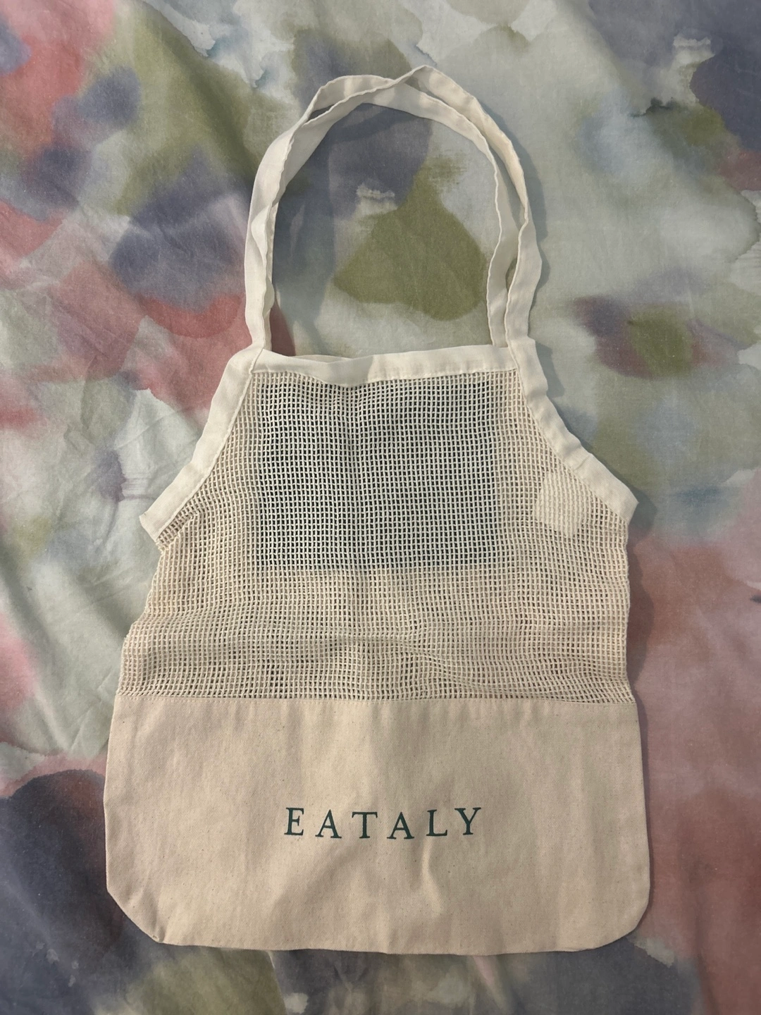 A natural coloured mesh tote bag. Features white straps and a solid bottom panel. The bag's brand name is printed on the bottom. Perfect for carrying your fresh produce on a relaxing trip to the market.