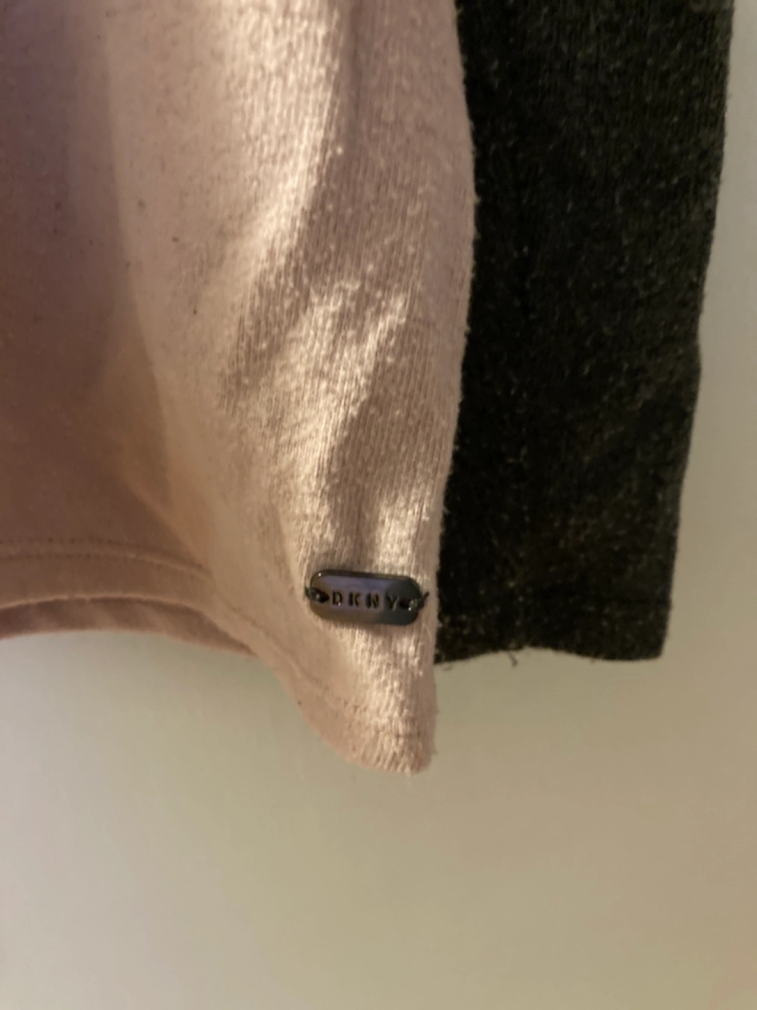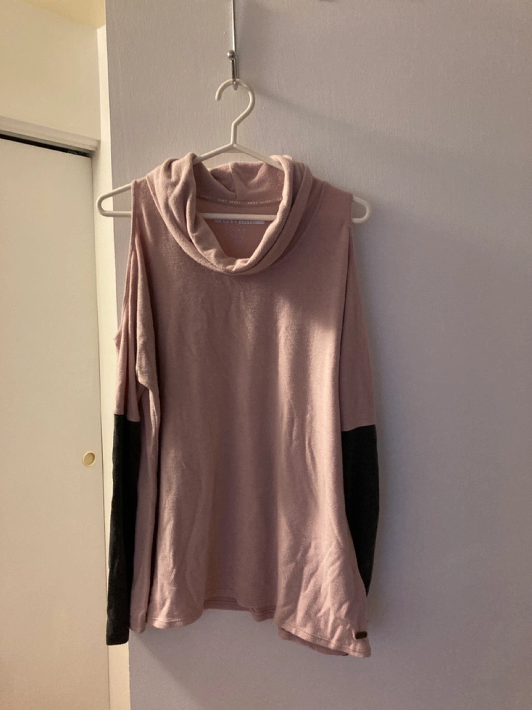 Womens DKNY Sport sweater. Pink and grey colour block. Cowl neck. Cold shoulder detail. Long sleeves. Relaxed fit.