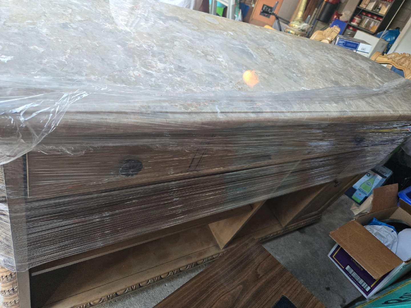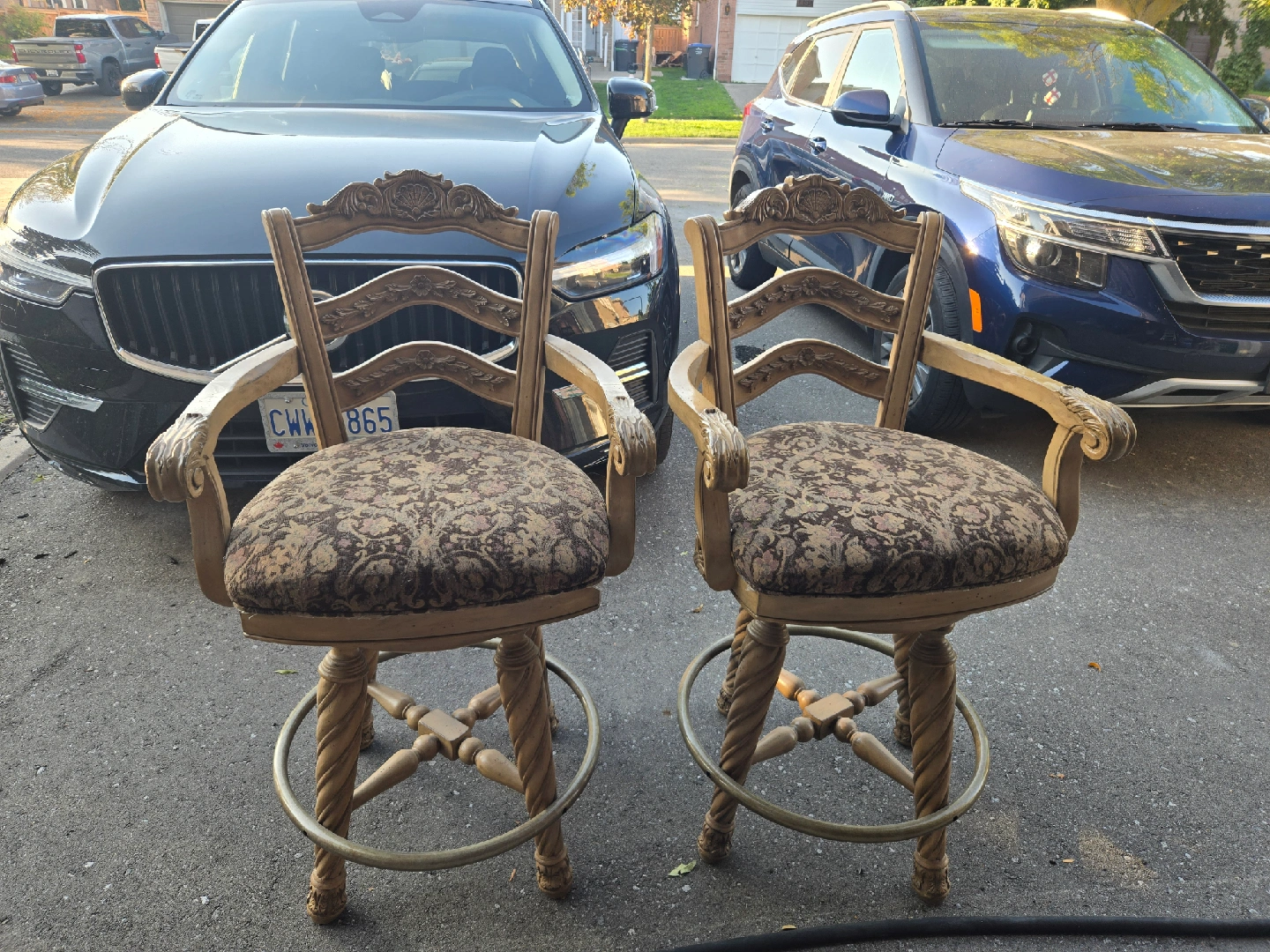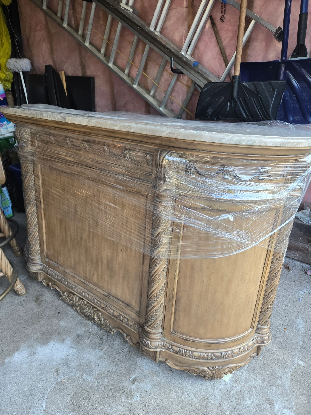 Selling a beautiful ornate bar with a marble top, along with two matching bar stools. The bar features detailed carvings and a classic design. The stools have a patterned fabric seat and a sturdy base. Perfect for adding a touch of elegance to your home! located in mississauga for pick up