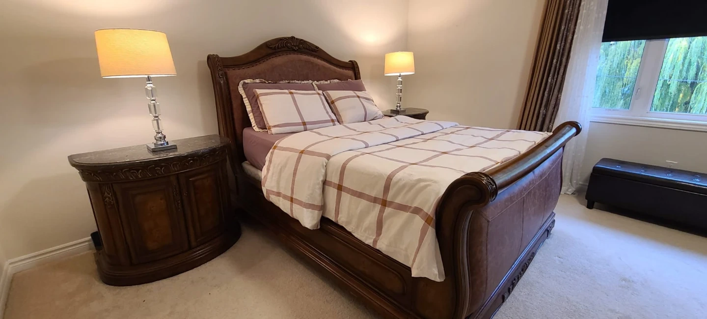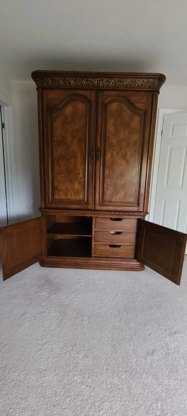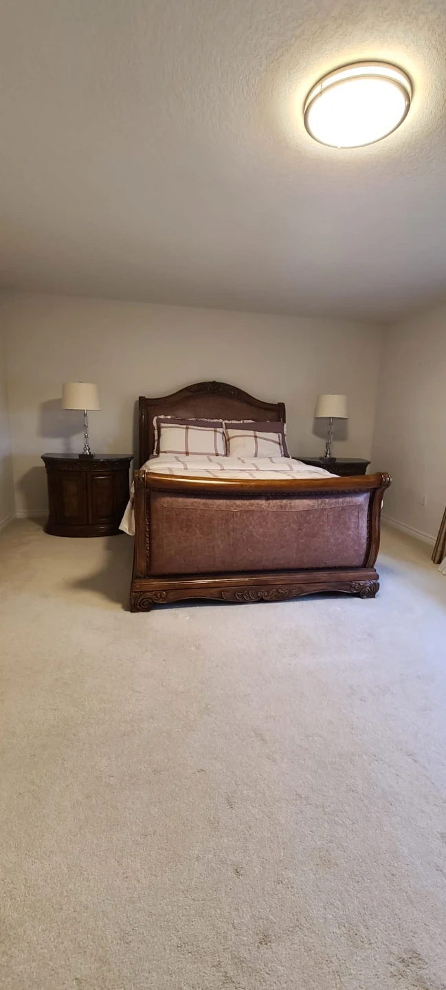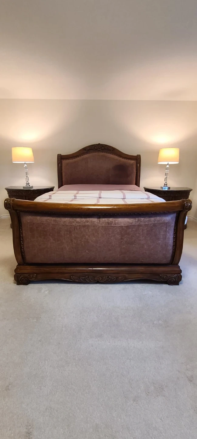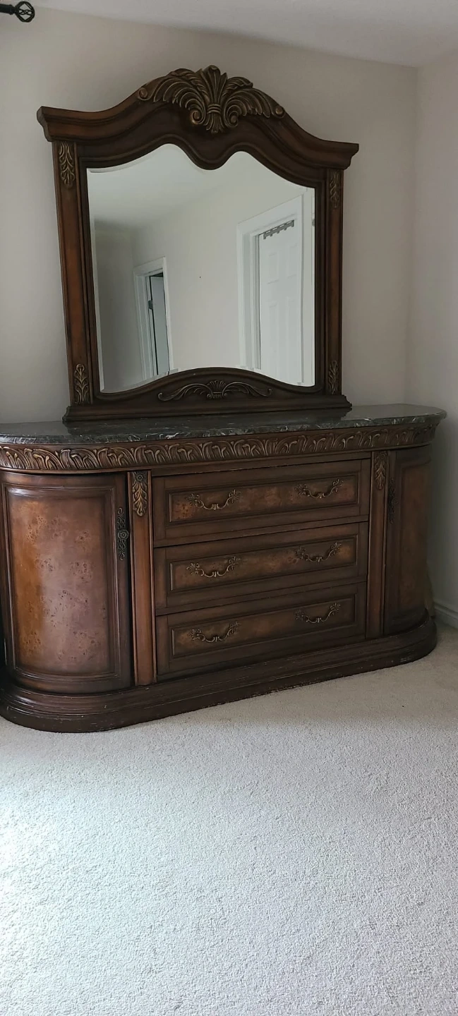 60Selling a beautiful, ornate bedroom set. Includes a dresser with a mirror, an armoire, a bed frame, and two nightstands. The set has a classic, elegant design with detailed carvings and a rich, dark wood finish. Perfect for adding a touch of luxury to your bedroom! Vintage Sleigh Style