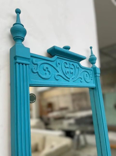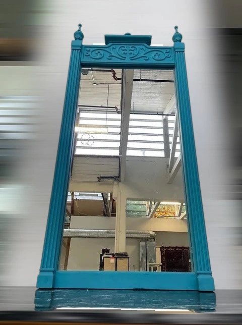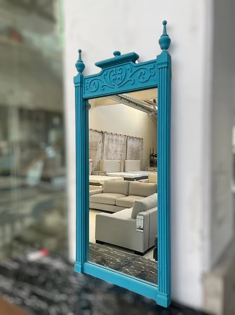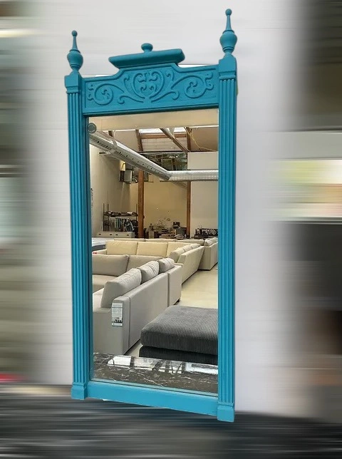 10Large ornate mirror with a blue painted frame. Features a detailed carved top piece and pillars.
