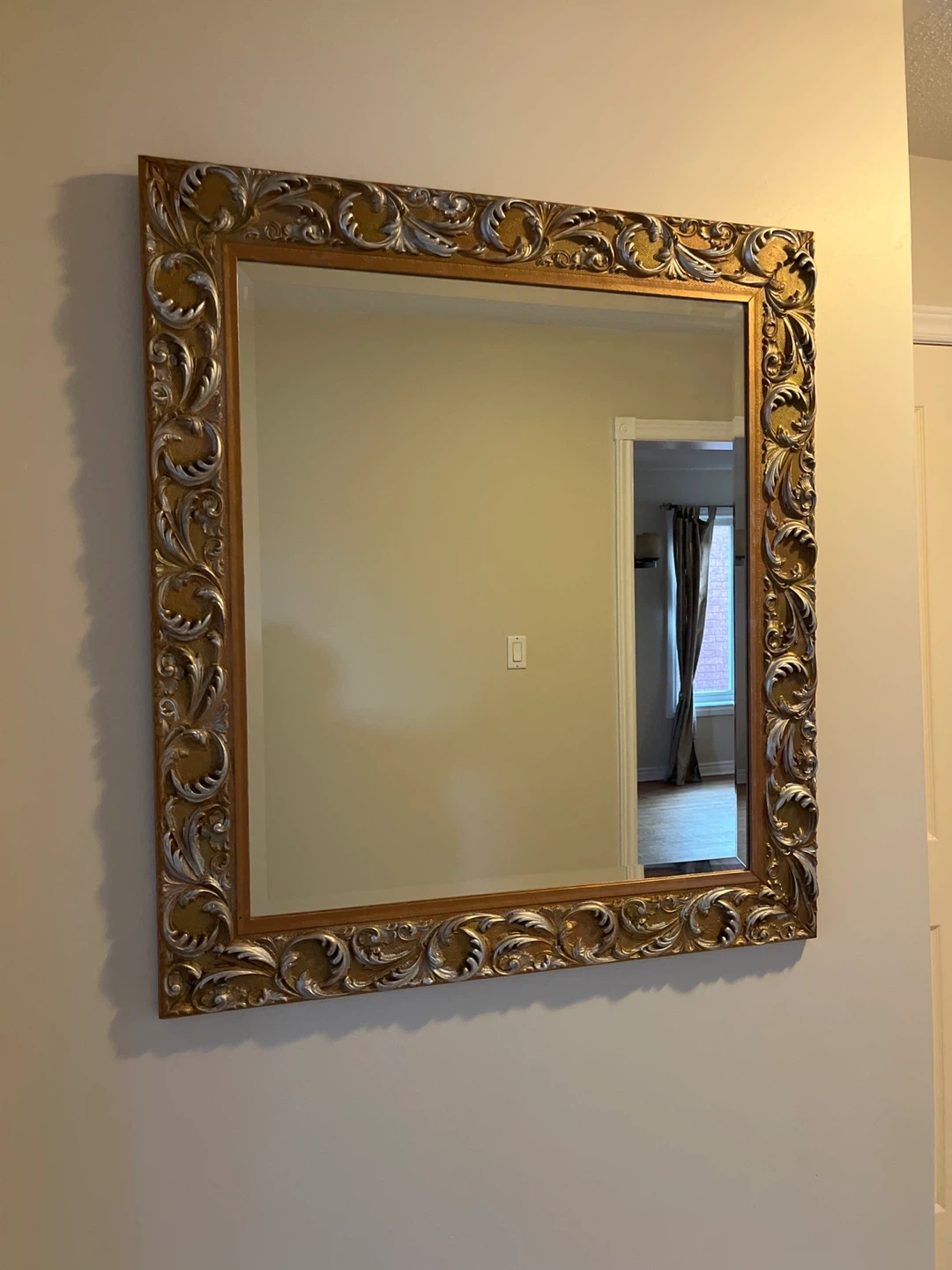 Selling a large beautiful wall mirror with an ornate gold and silver frame. It's in great condition and would add a touch of elegance to any room. The frame has intricate detailing that really catches the eye! CASH only please.