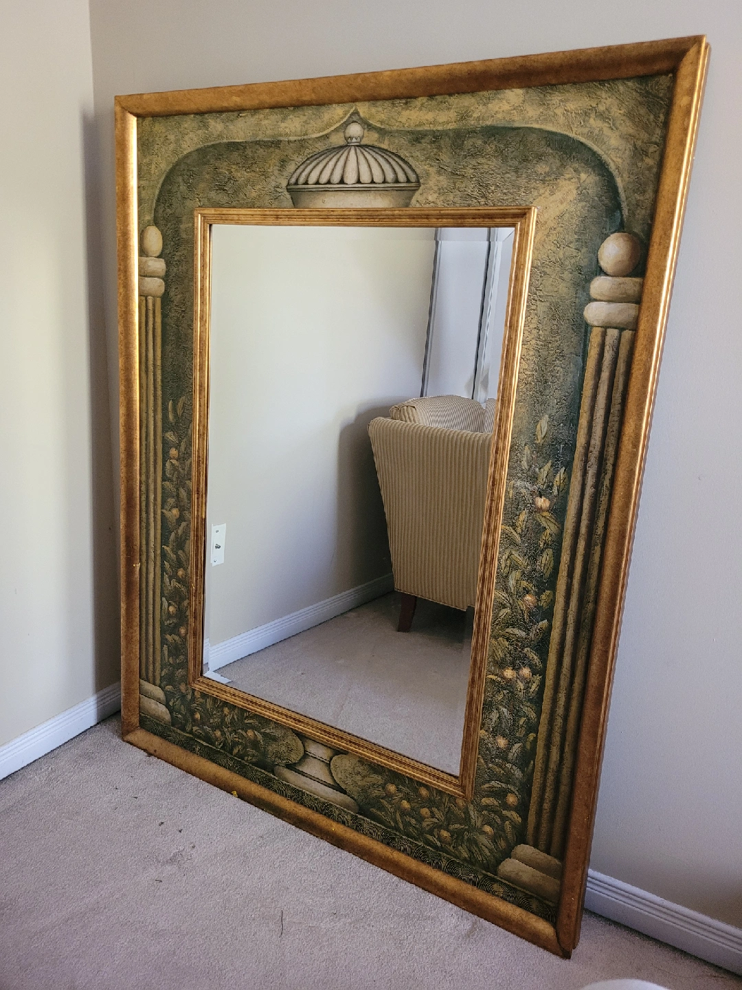 Selling a beautiful ornate mirror with a gold frame. It's in great condition and would add a touch of elegance to any room. The frame has a unique design with decorative pillars and floral accents.