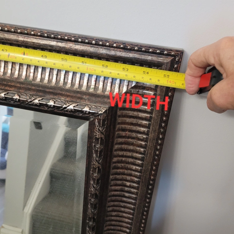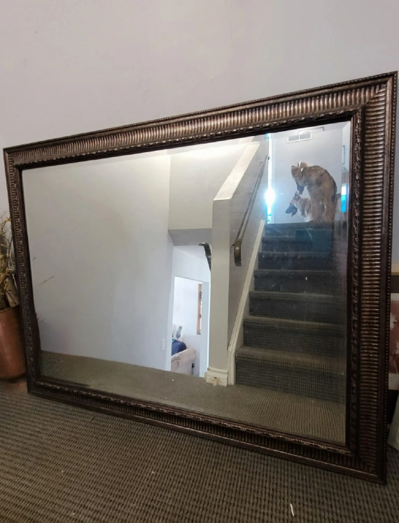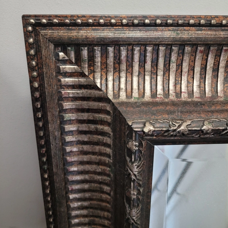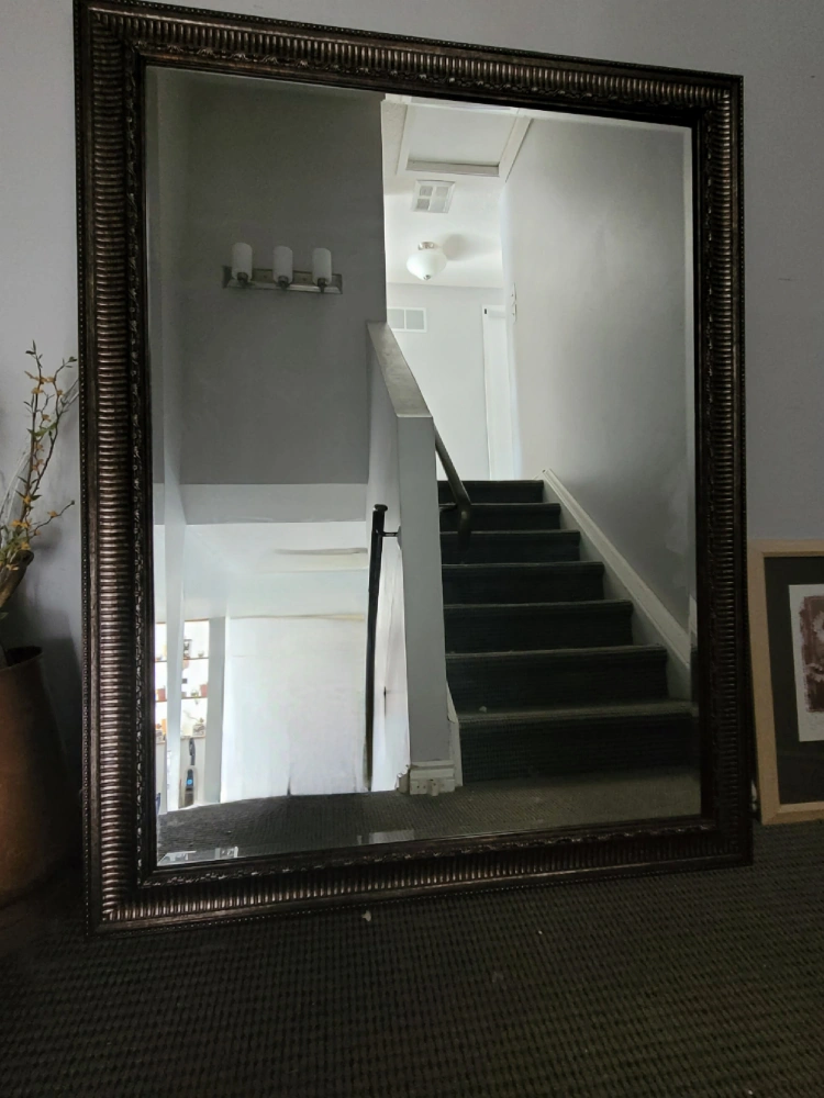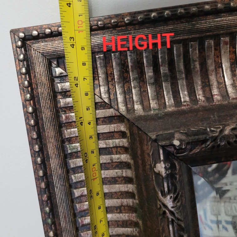 Selling a large, decorative framed wall mirror. Ready to add some style to your home. The dimensions are approximately 55 inches wide and 43 inches high. Has hooks on the back for hanging. Backing paper has repairs.