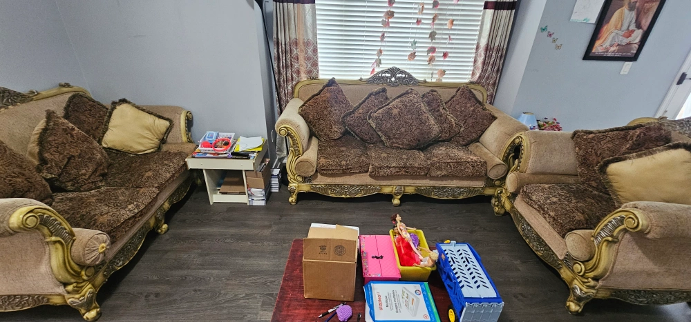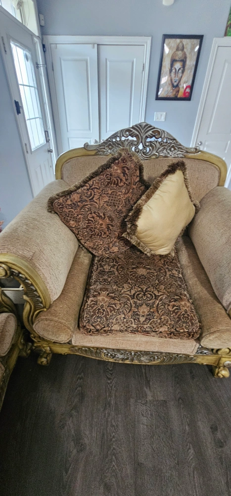 Selling a beautiful ornate sofa set. It includes a sofa and one armchair, and a loveseat, all with a detailed pattern and gold trim. The cushions are included. Perfect for adding a touch of elegance to your living room!