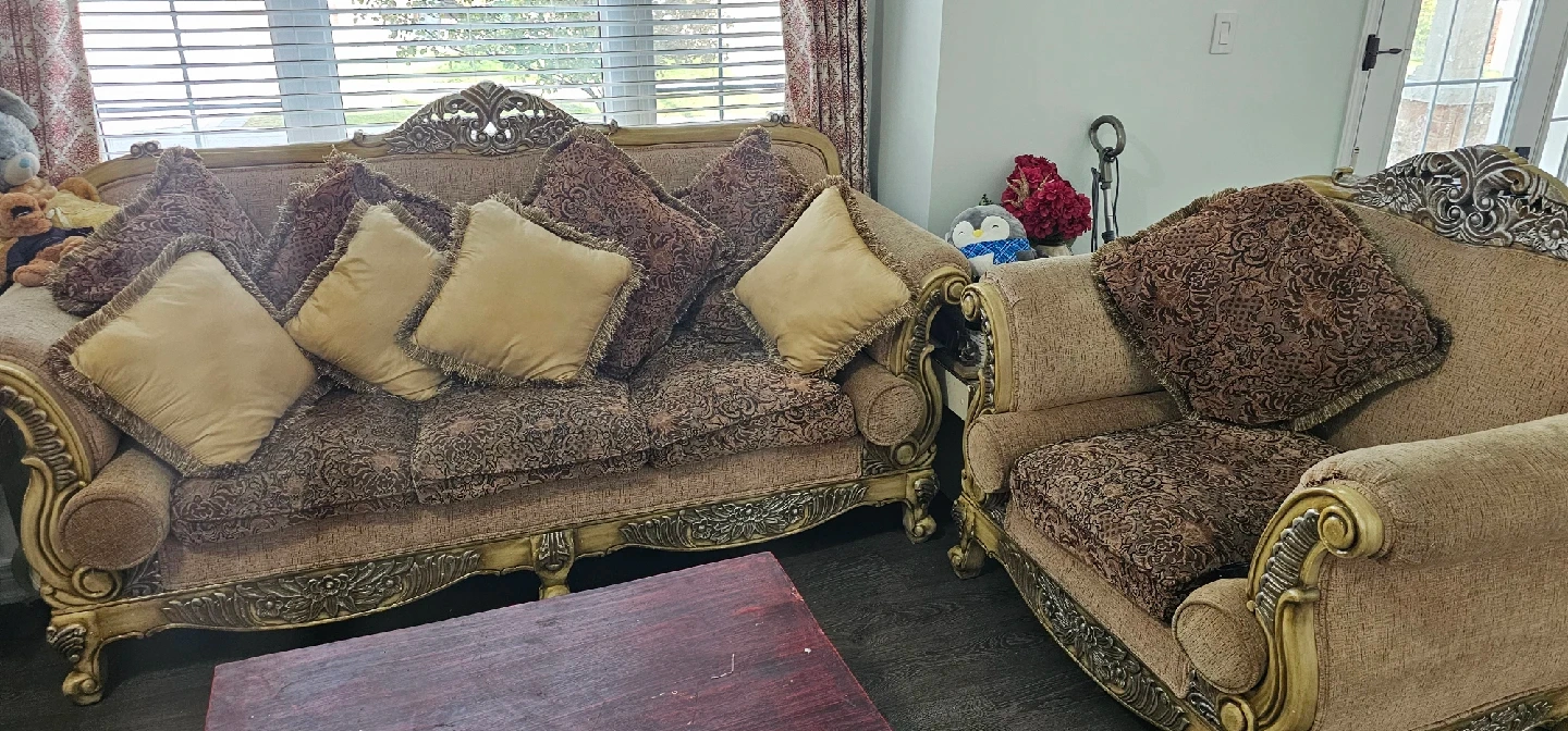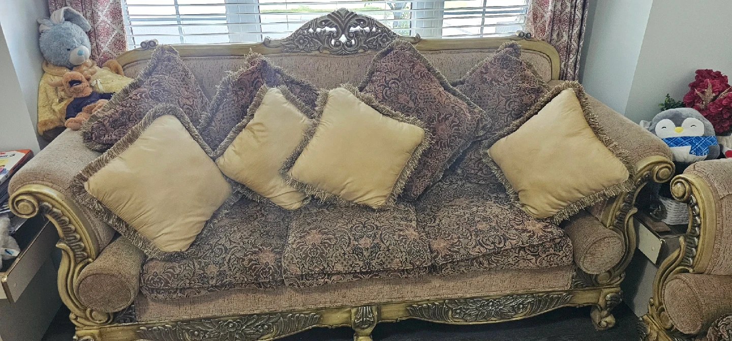 Selling a beautiful ornate sofa set. It includes a sofa and one armchair, and a loveseat, all with a detailed pattern and gold trim. The cushions are included. Perfect for adding a touch of elegance to your living room!