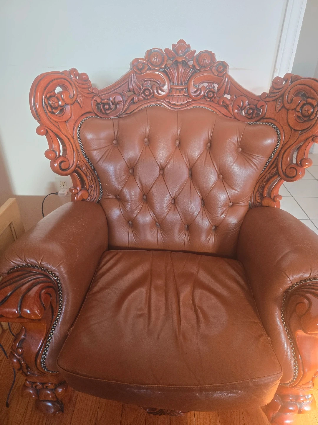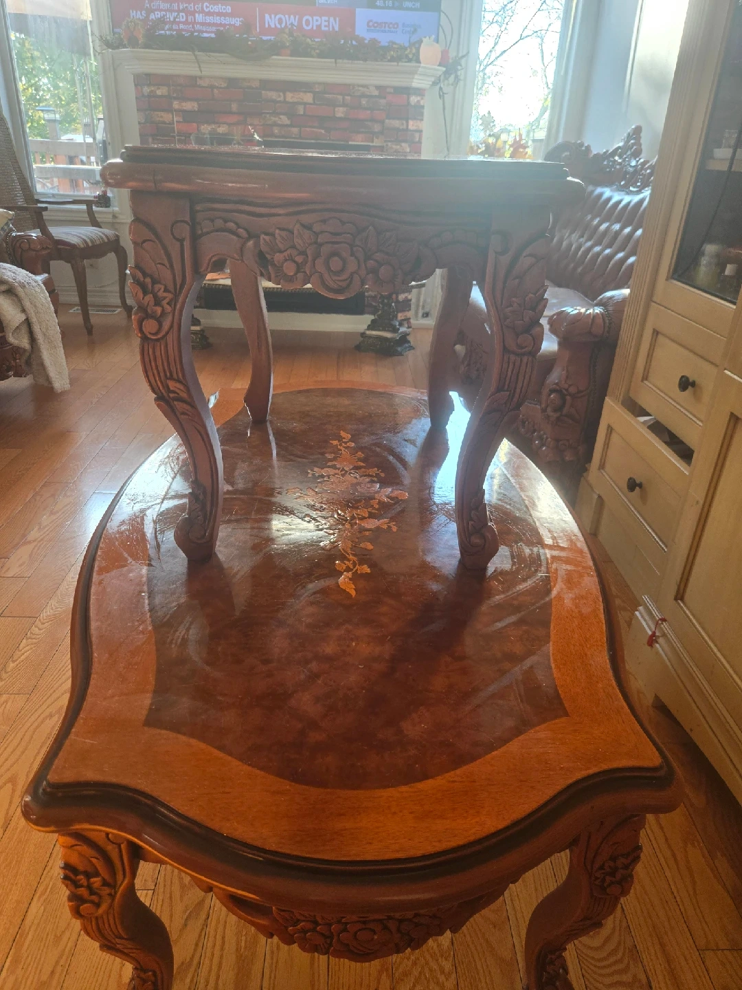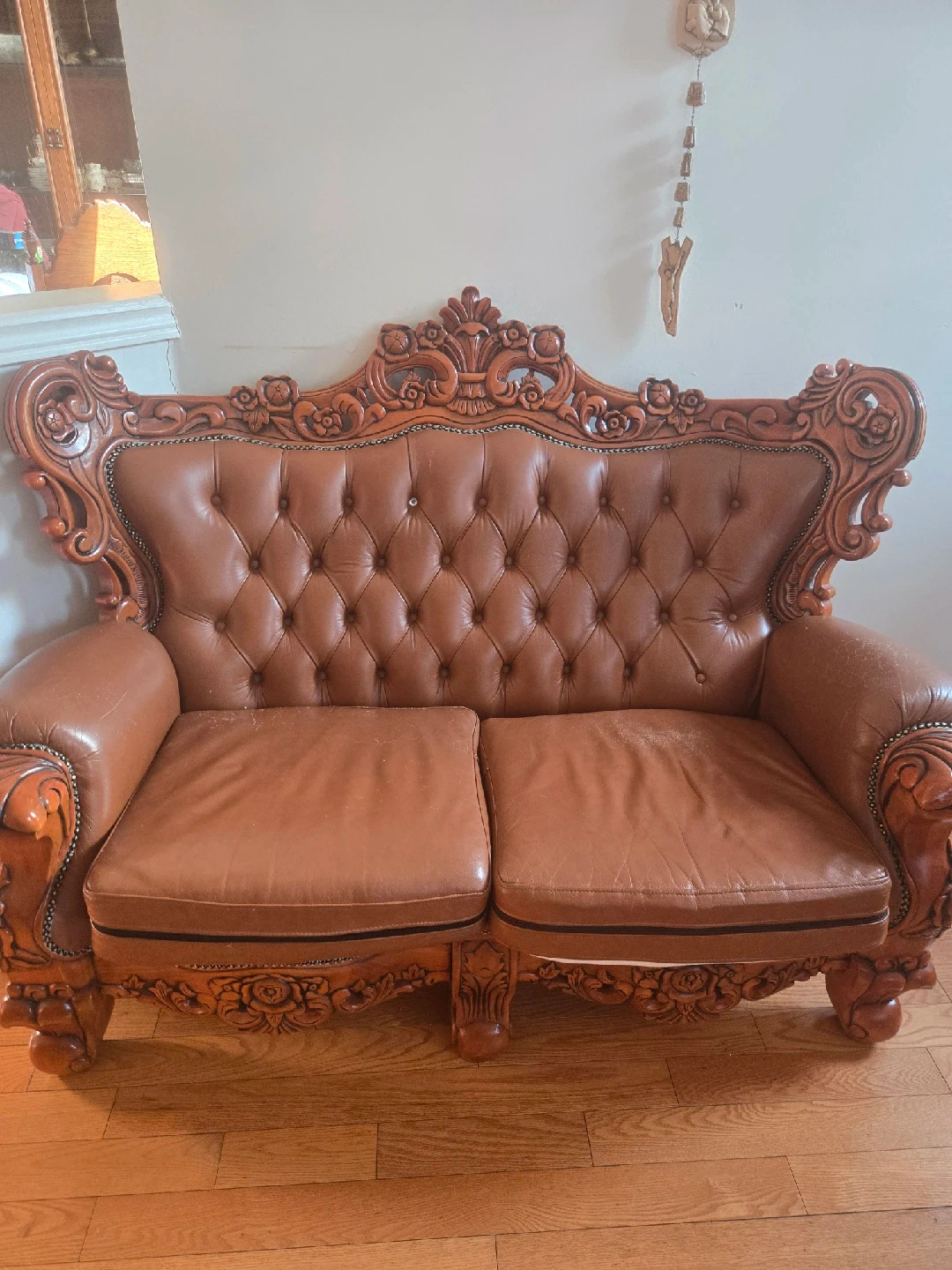 60Selling a beautiful, ornate wood coffee table along with a matching sofa and armchair set. The pieces feature intricate carvings and a rich, warm finish. They'd be a great addition to a living room!