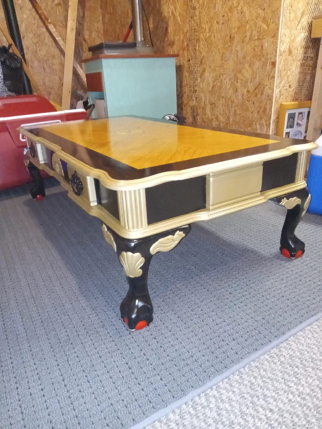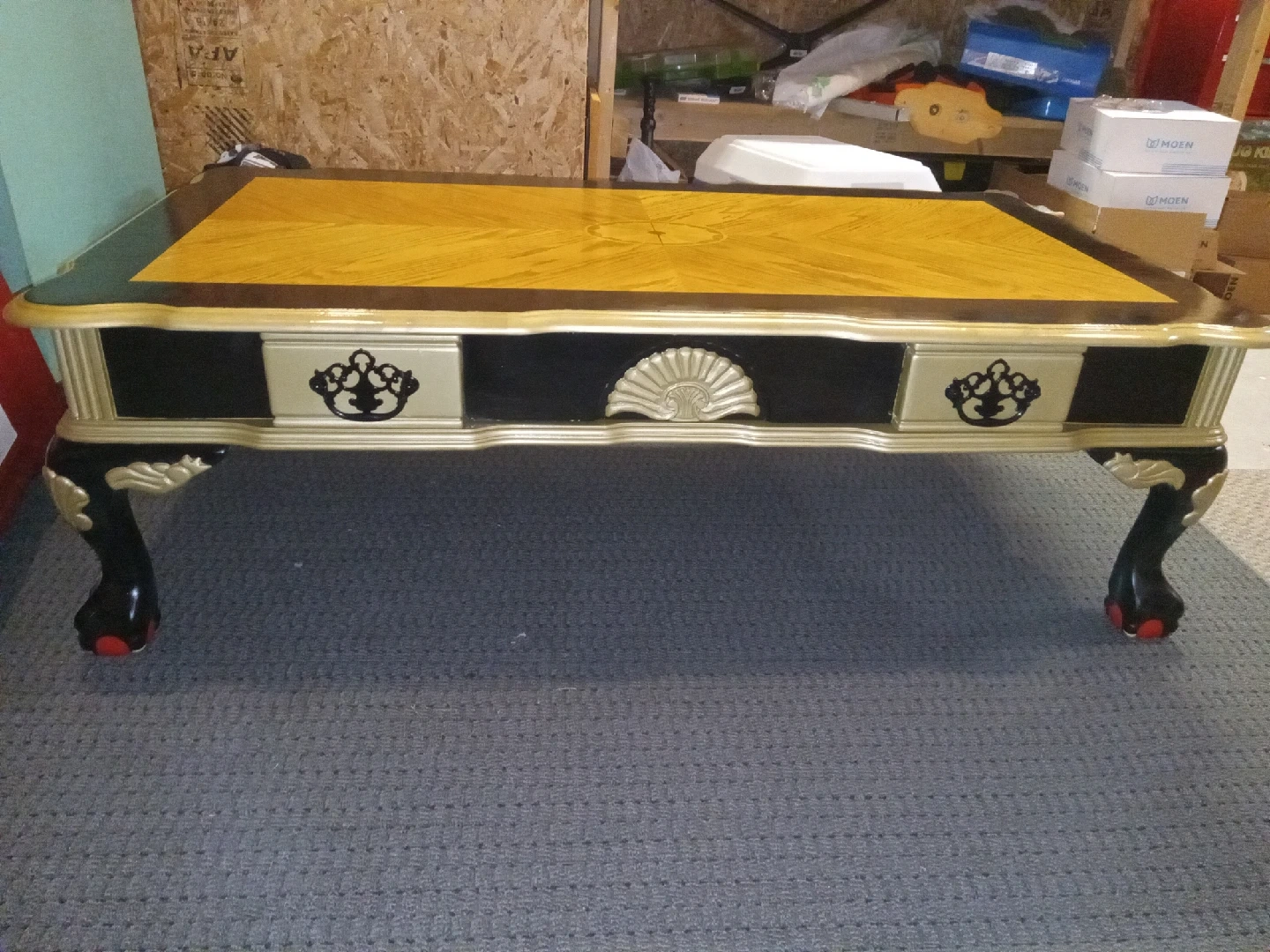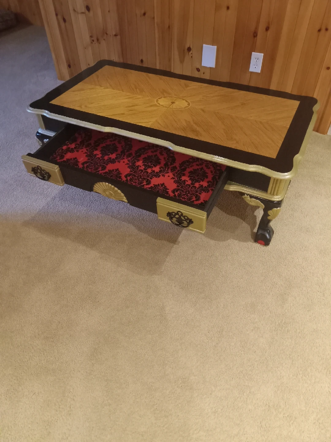 15Selling a unique coffee table with a beautiful wood top, gold trim, and ornate black legs. It features drawers lined with a red patterned fabric. A great statement piece for your living room! **May Deliver for an extra fee depending on location.**