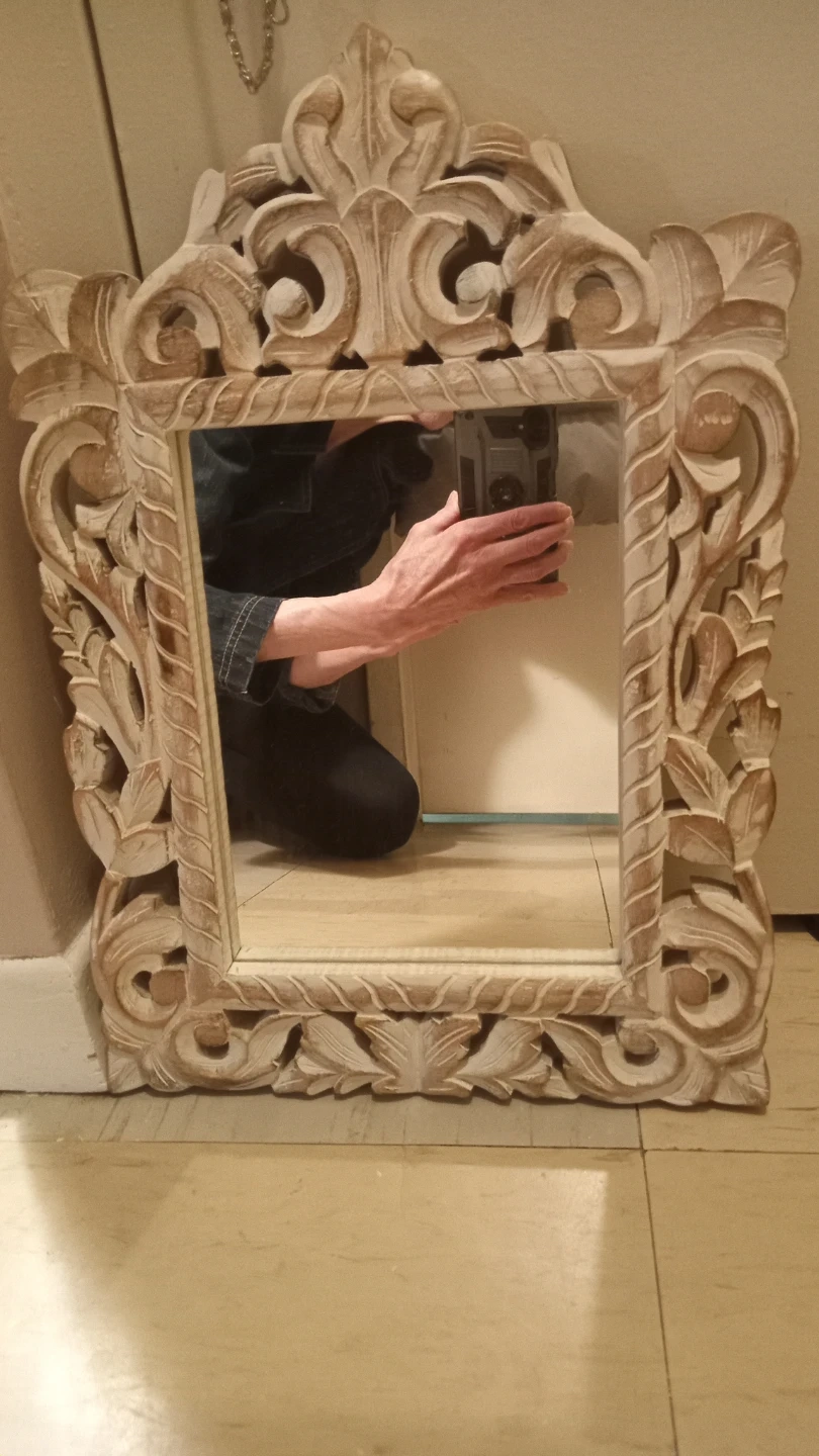 35Selling a lovely ornate wood mirror with a gold design. It's in great condition and would add a touch of elegance to any room! Has hook already to be hung