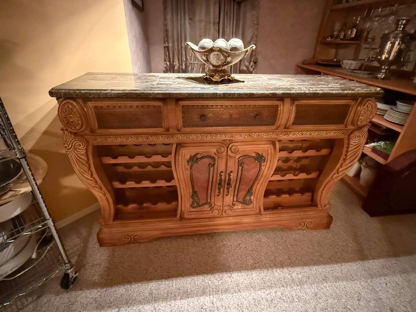 10Beautiful ornate wooden bar cabinet with a marble top. It has a unique design with detailed carvings and plenty of storage space for bottles and glassware. Perfect for adding a touch of elegance to your home!